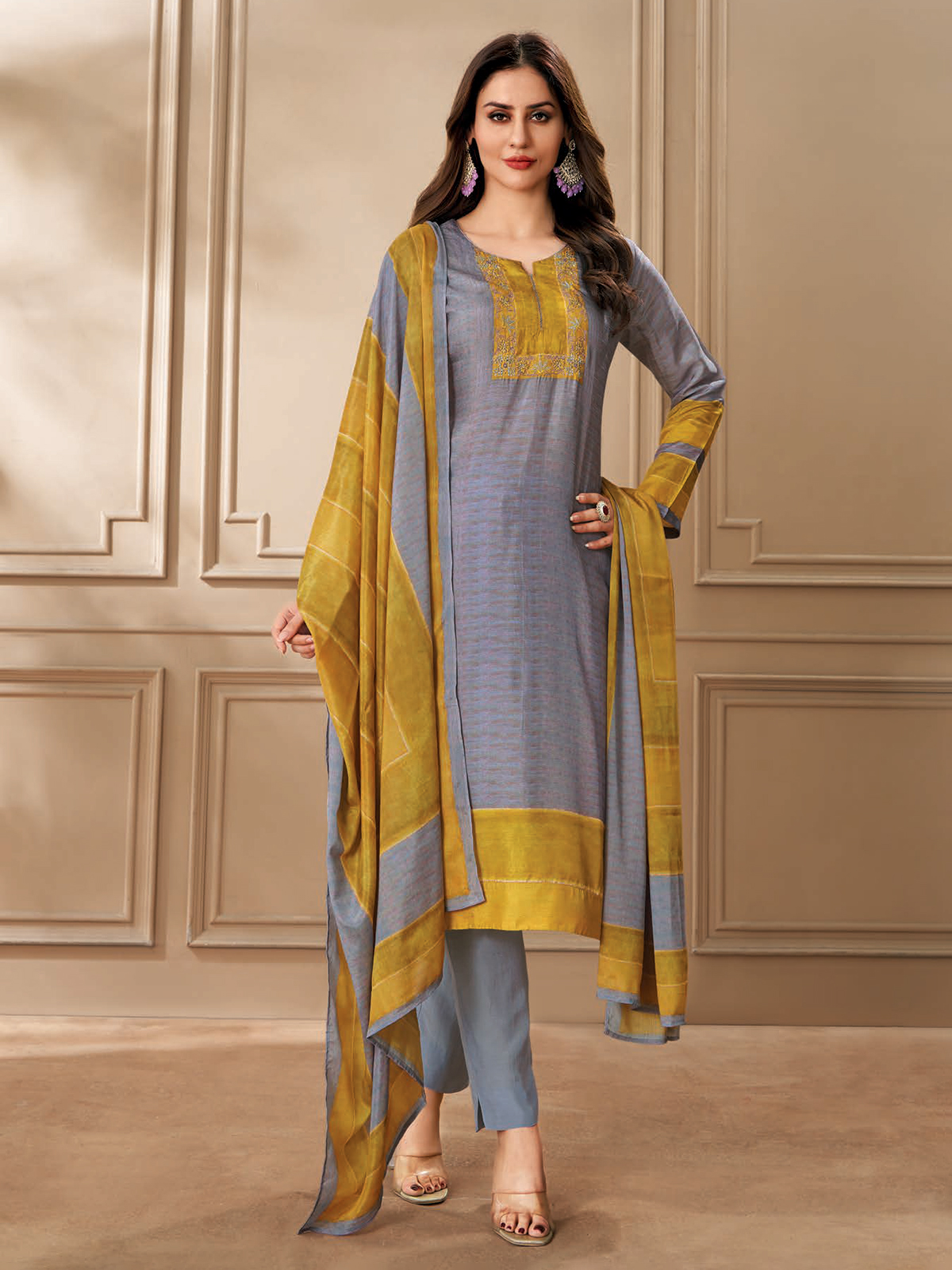 Graceful Grey Dola Silk Suit With Traditional Motifs