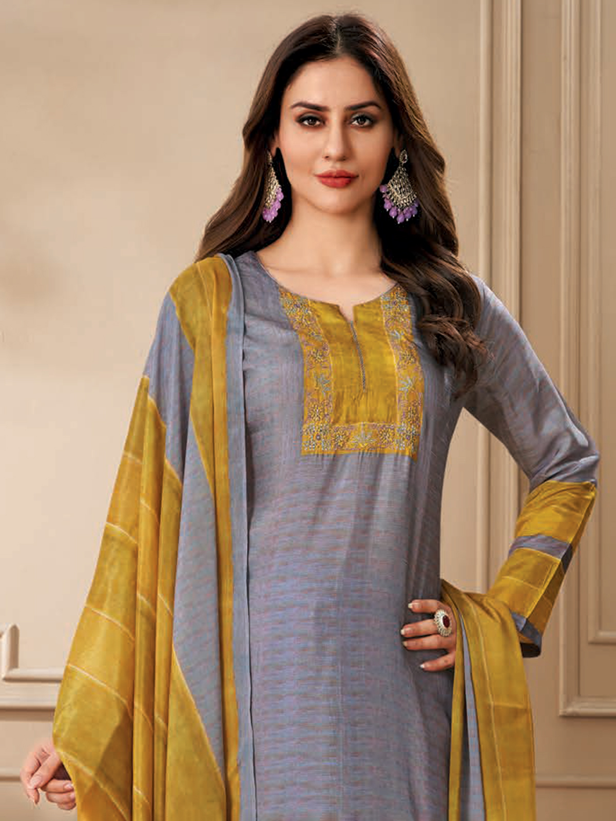 Blending tradition with modern design, this straight cut grey salwar suit is made from fine dola silk. The round neckline and quarter sleeves enhance its sleek, versatile appeal perfect for both casual and festive occasions.