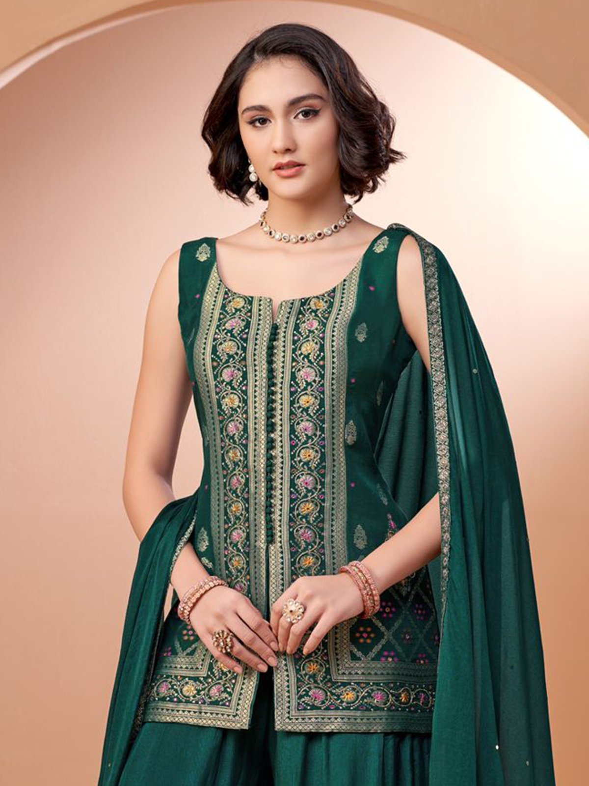 Vibrant and festive, this green chiffon palazzo suit features fine thread, zari, and aabla embellishments. A sleeveless round-neck silhouette enhances its graceful drape, while the matching dupatta completes the look. Perfect for weddings, Diwali celebrations, and festive gatherings where elegance is desired.