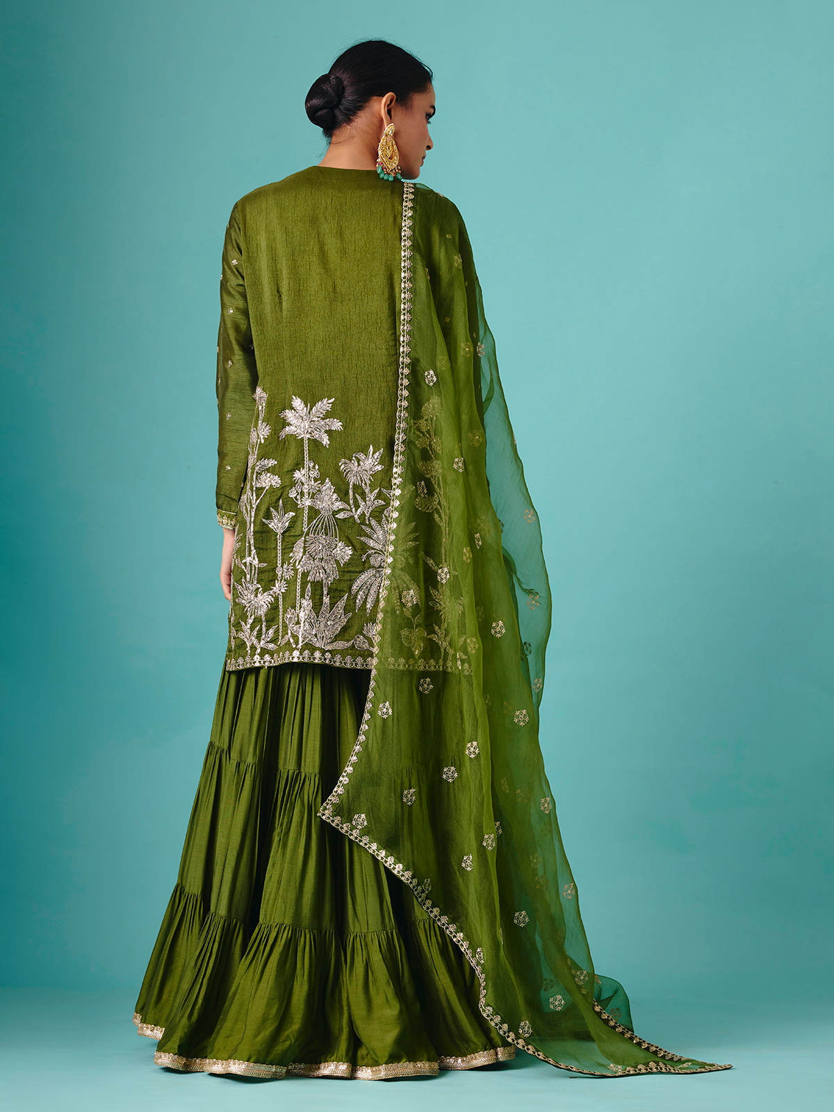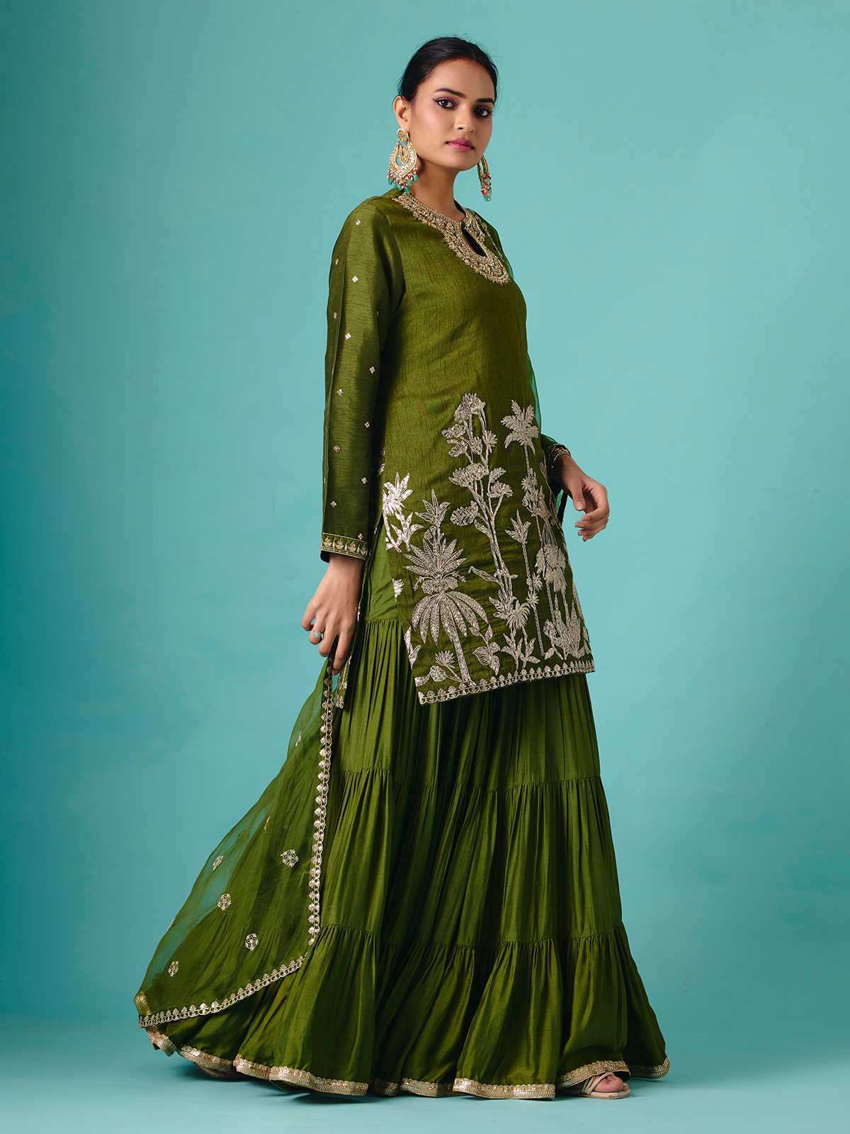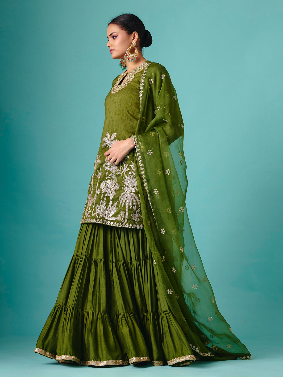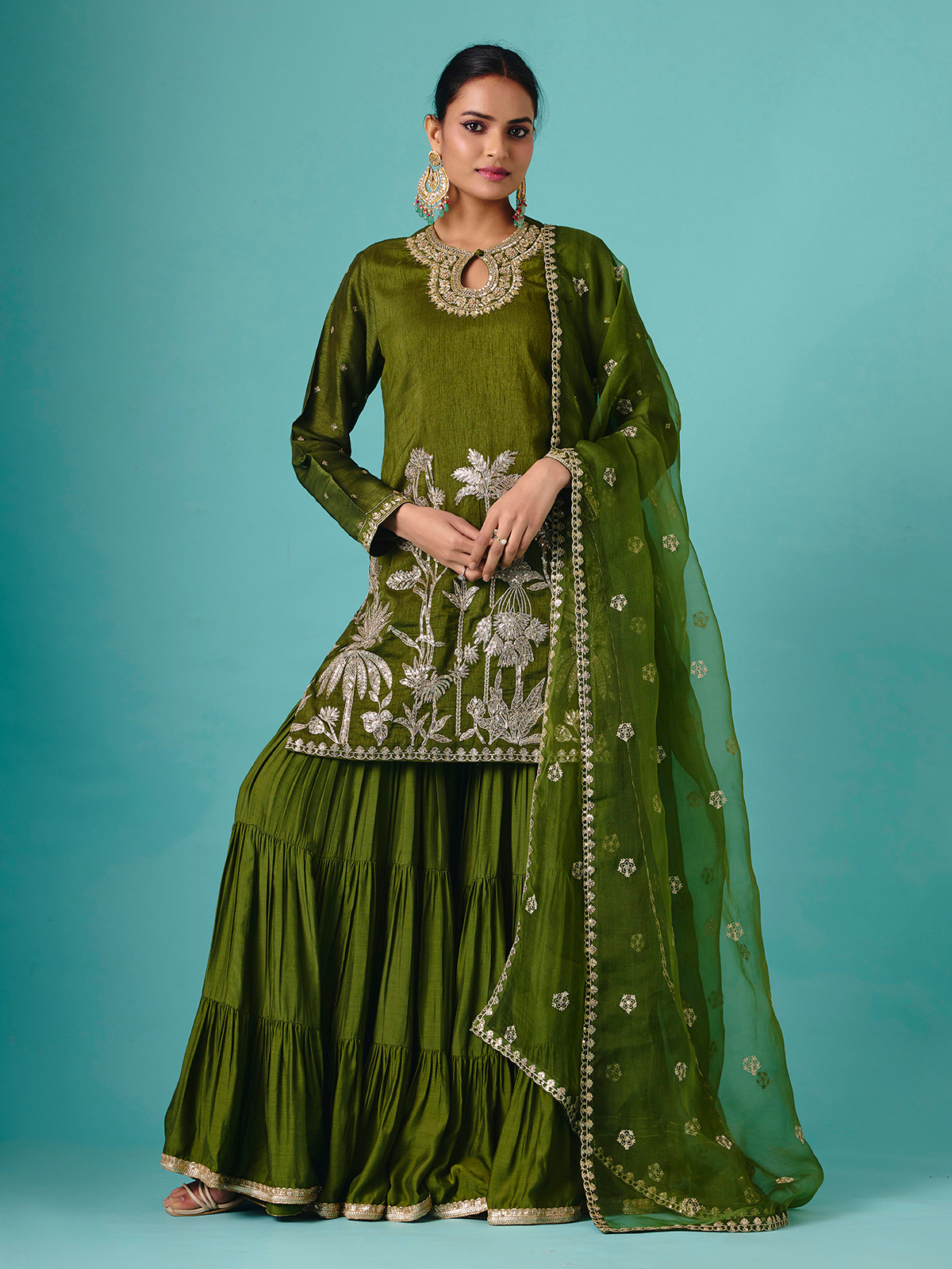 This green chinon silk sharara suit shines with sequins, beads, and cutdana detailing. Full sharara bottoms offer flowing movement, while the net dupatta enhances ethereal appeal. Perfect for wedding, reception, sangeet, and mehndi, it radiates graceful charm, subtle shimmer, and ornate artistry, making a statement of refined elegance and festive luxury.