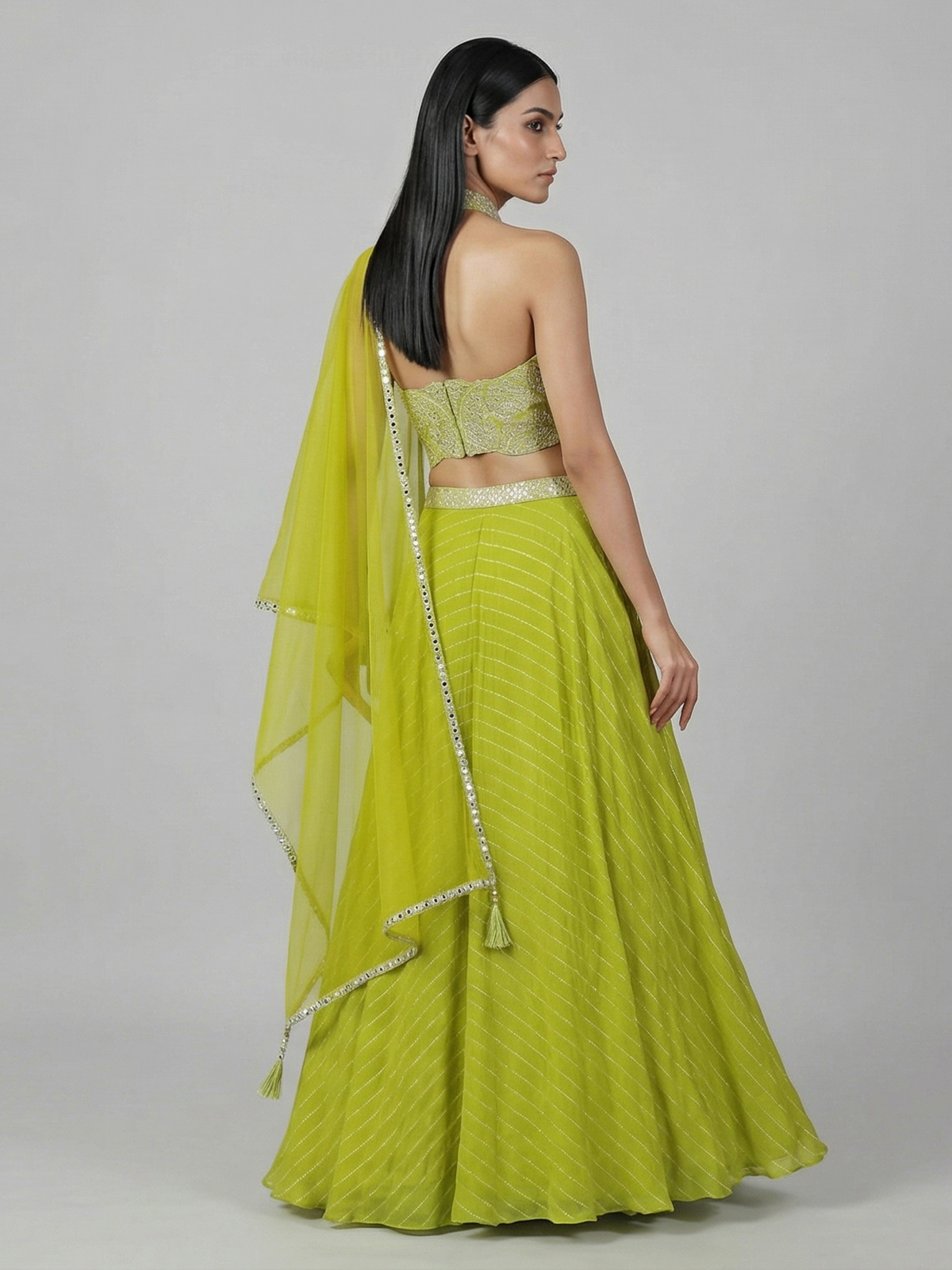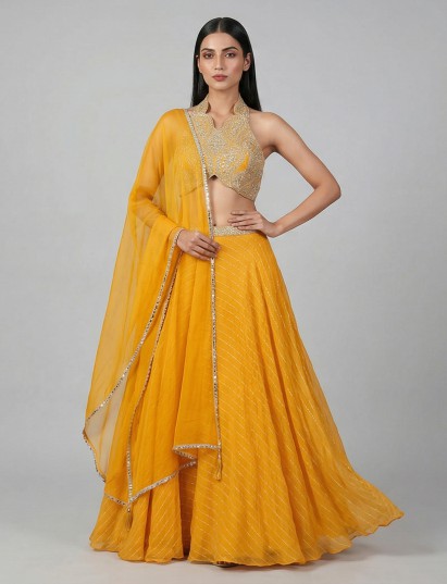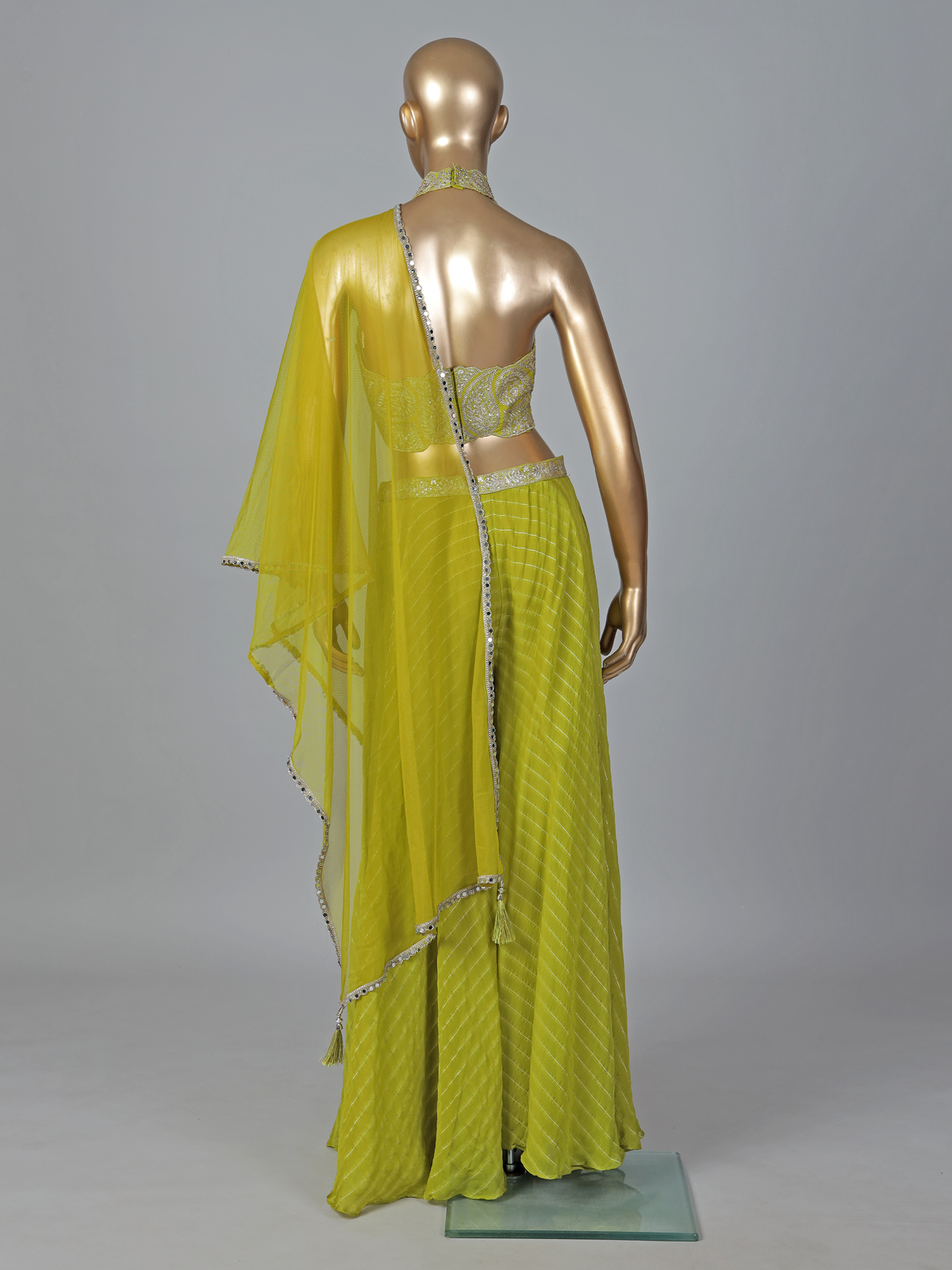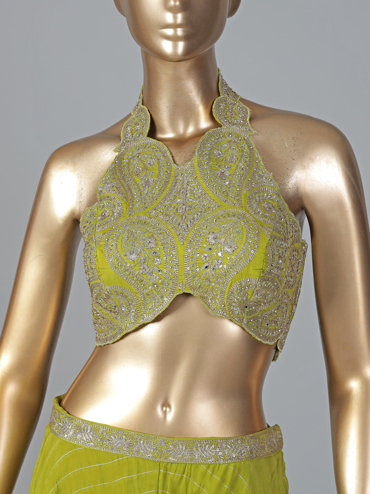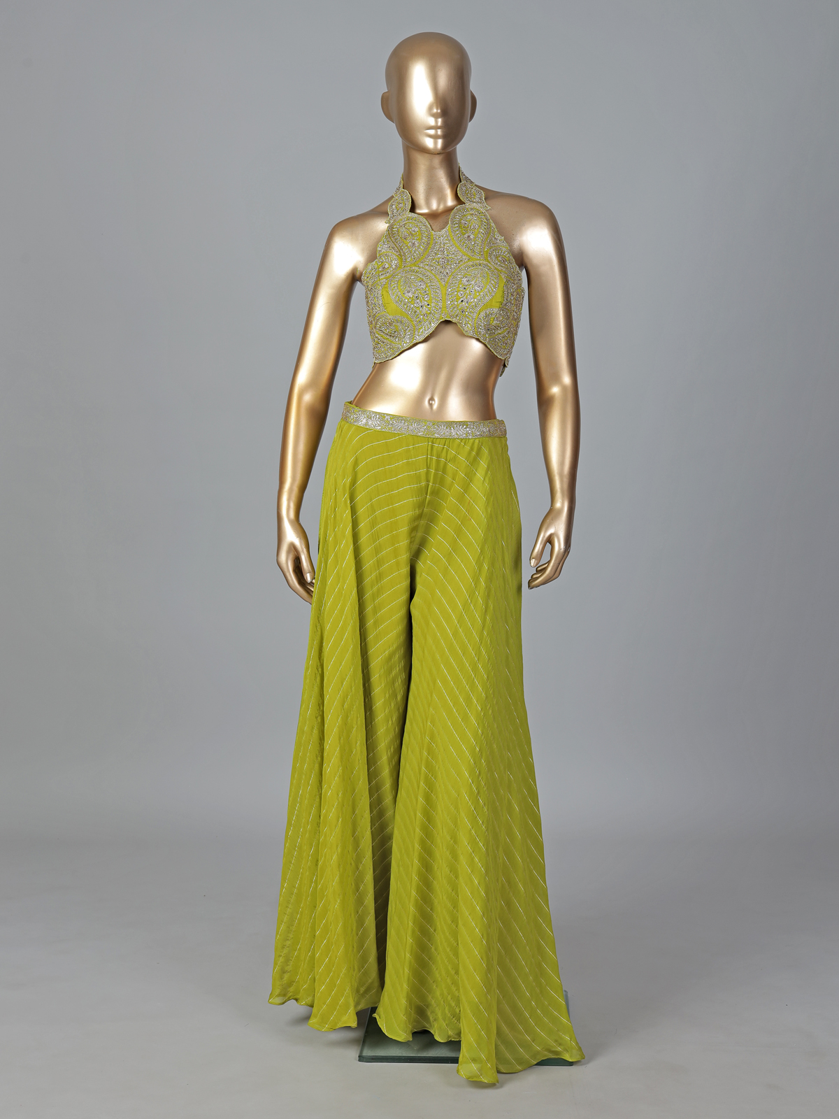 Graceful and versatile, this green georgette Indo-western palazzo suit showcases mirror, zari and sequin detailing. The halter neckline and sleeveless design enhance its modern appeal, making it perfect for weddings and mehendi functions.