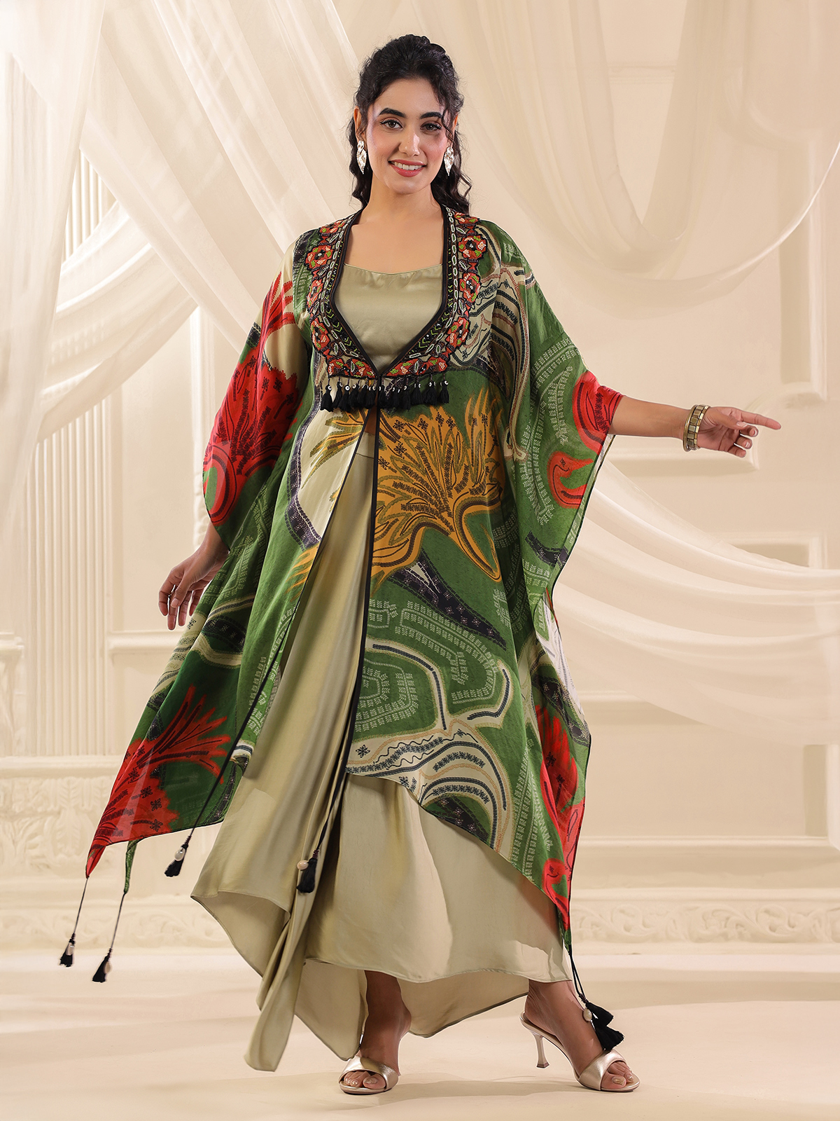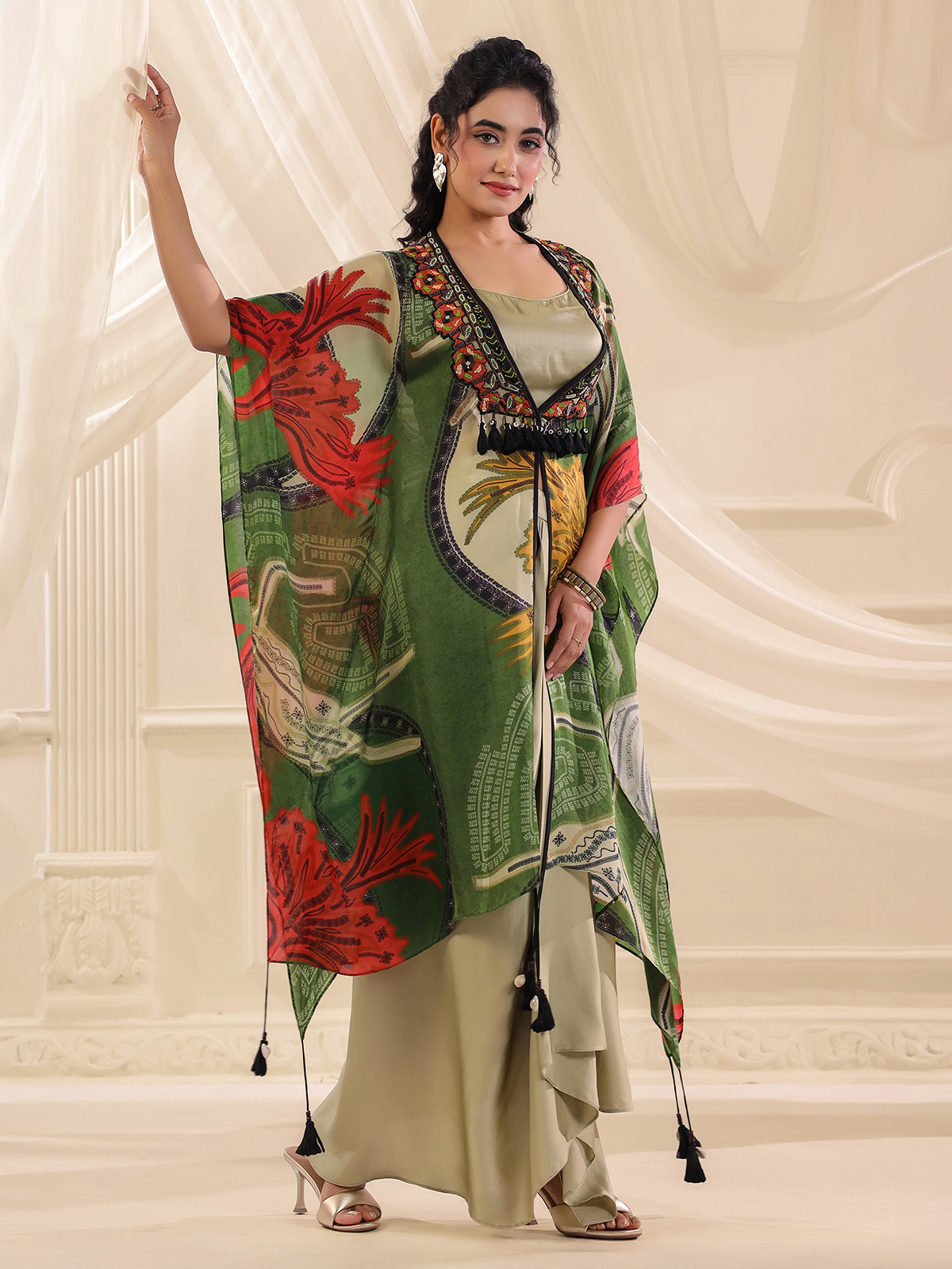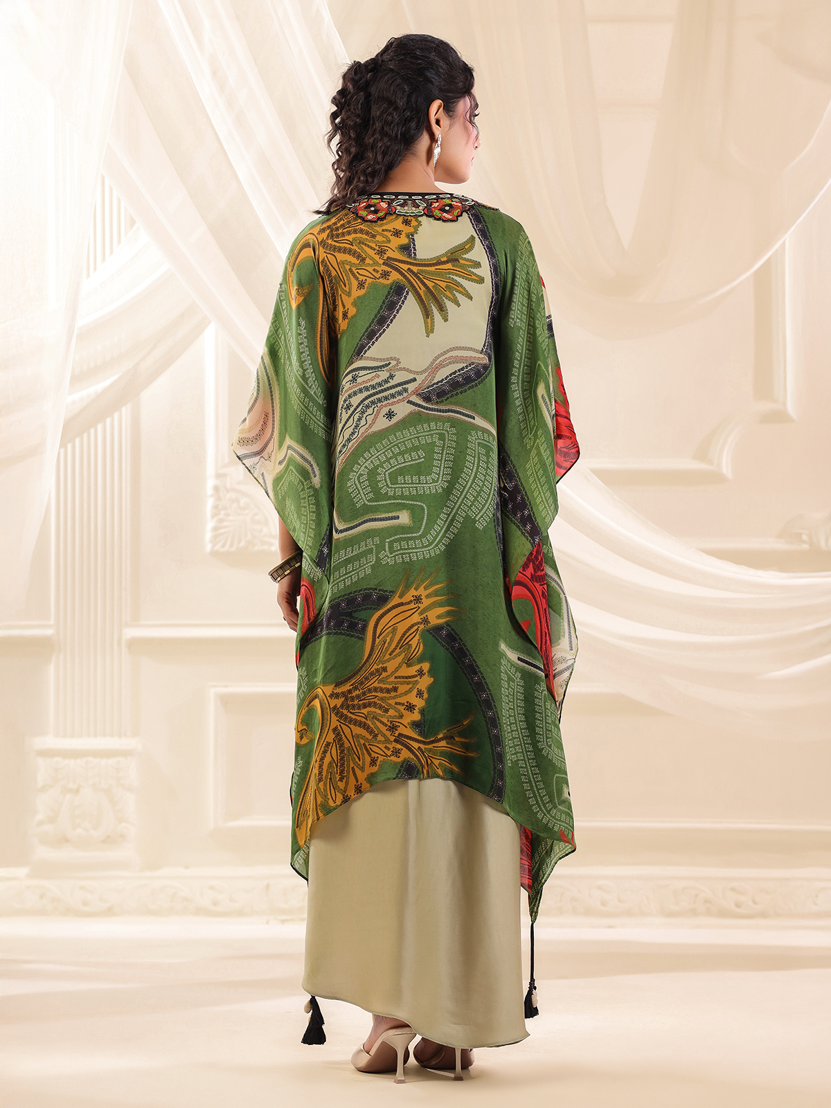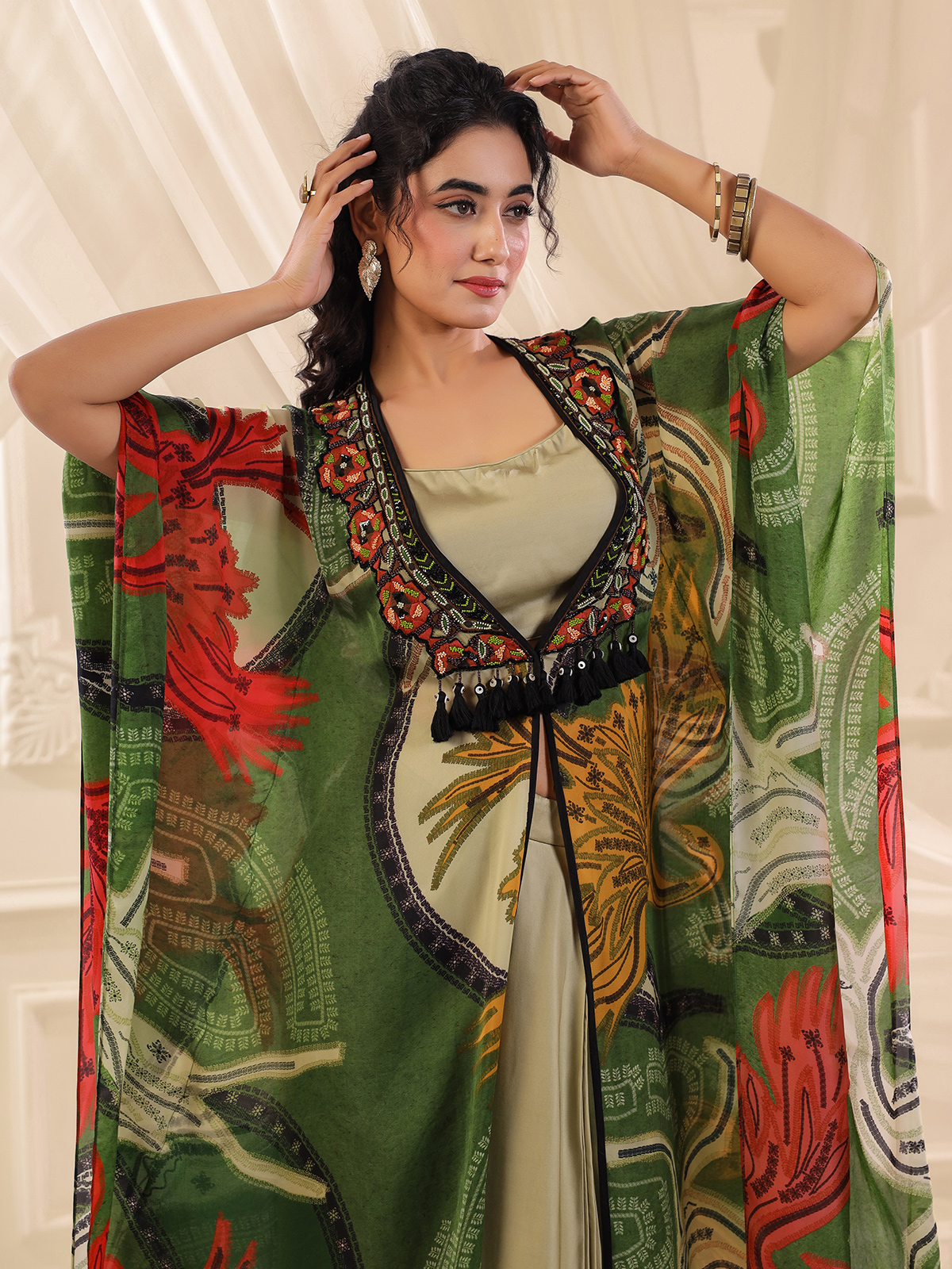 Refreshing green tones highlight this georgette silk indowestern suit crafted in kaftan style. Embellished with beads, thread and mirror work. It reflects subtle elegance. The flowing silhouette ensures comfort and style. Making it perfect for festive gatherings and modern celebrations.