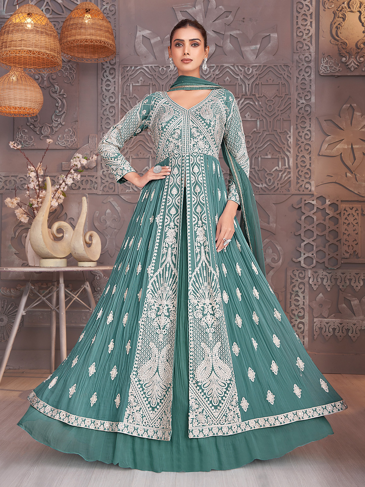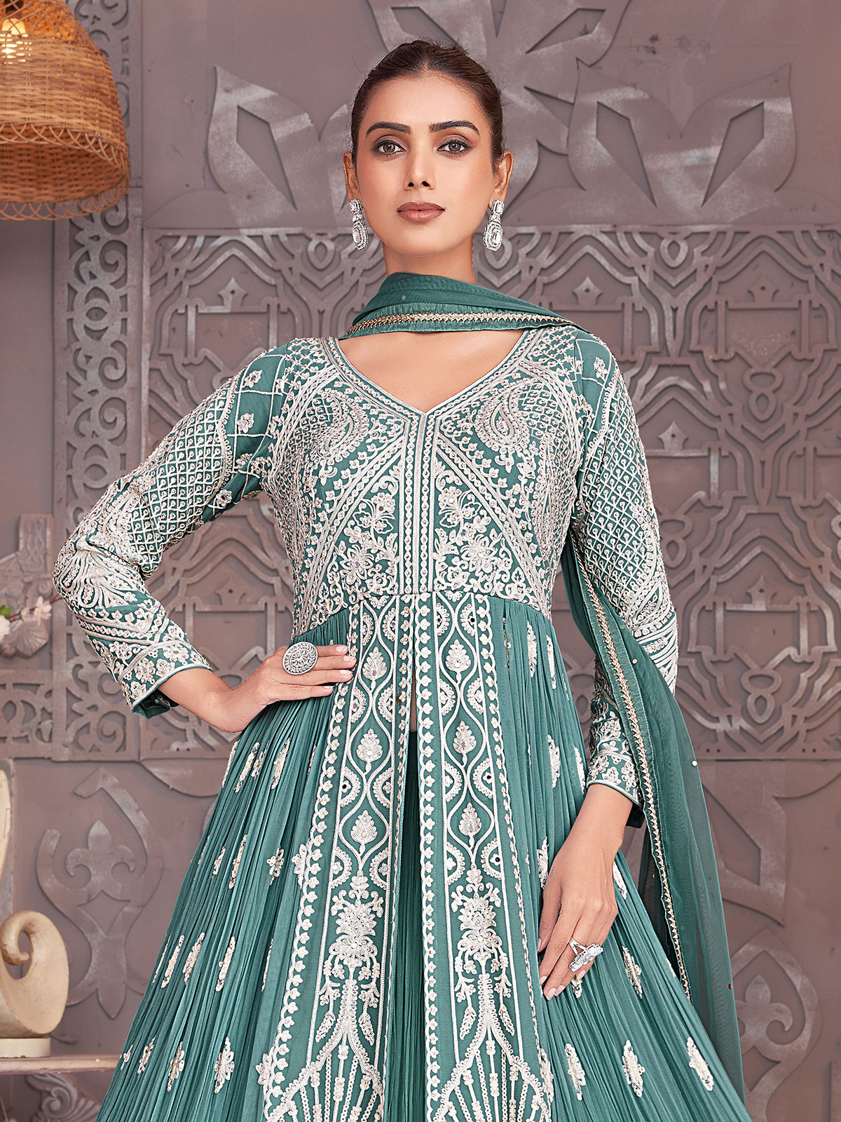 Celebrate in style with this green georgette Pakistani lehenga, decorated with stones, mirror, embroidery, zari, and sequins. Featuring a V-neck, quarter sleeves, and a matching dupatta, it offers a sophisticated and festive look for Diwali and wedding occasions.