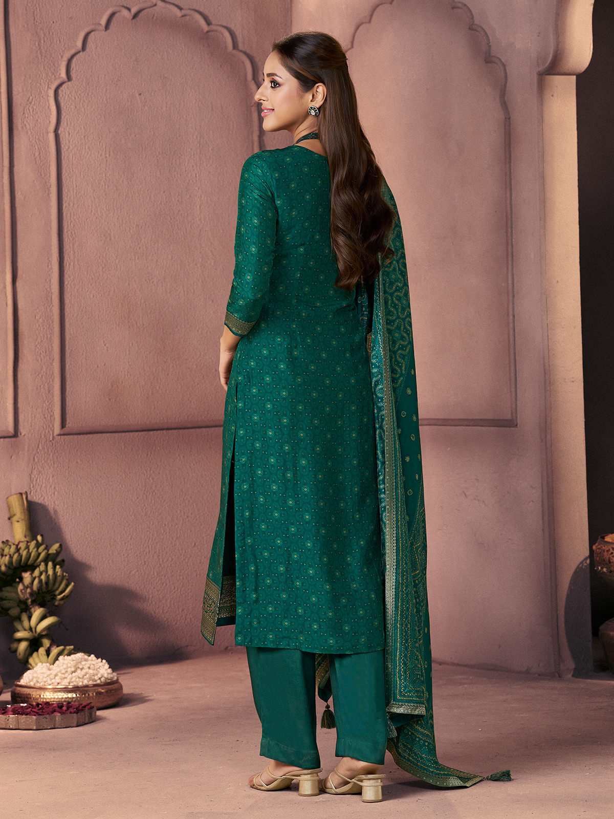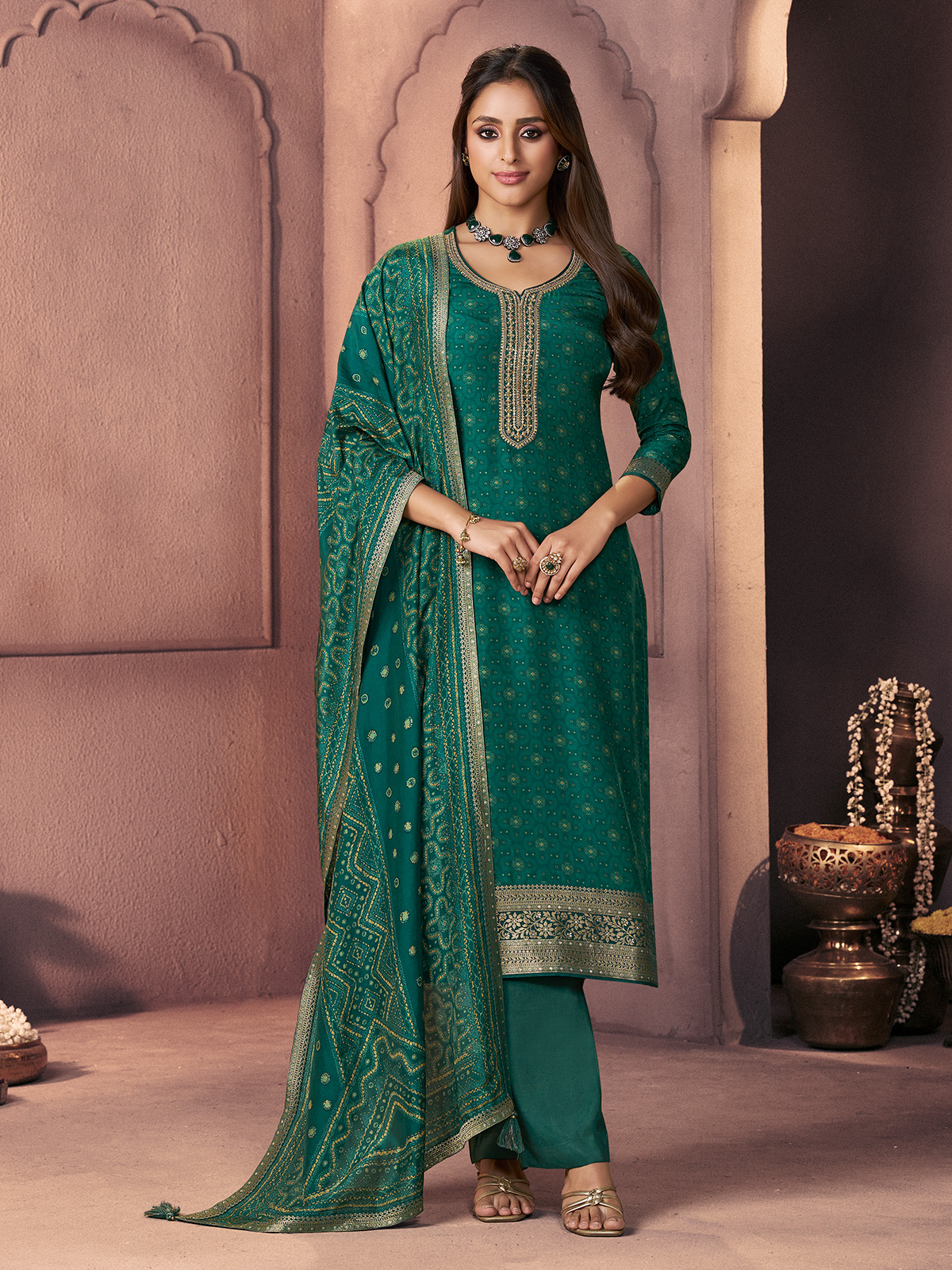 This green silk creation features sequins, zari, zardosi, embroidery, and cutdana detailing across the kurti. Printed work and decorative borders on the neckline and sleeves elevate its traditional look. Paired with a printed dupatta and tailored pocket pants, it is perfect for festive events and mehndi celebrations.