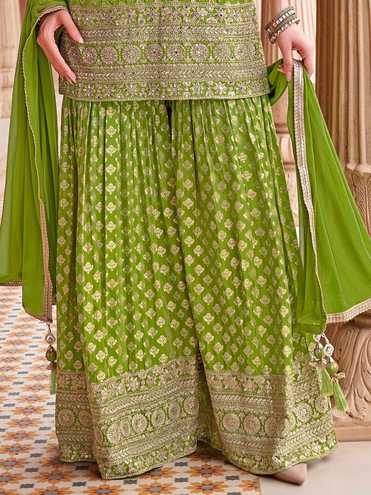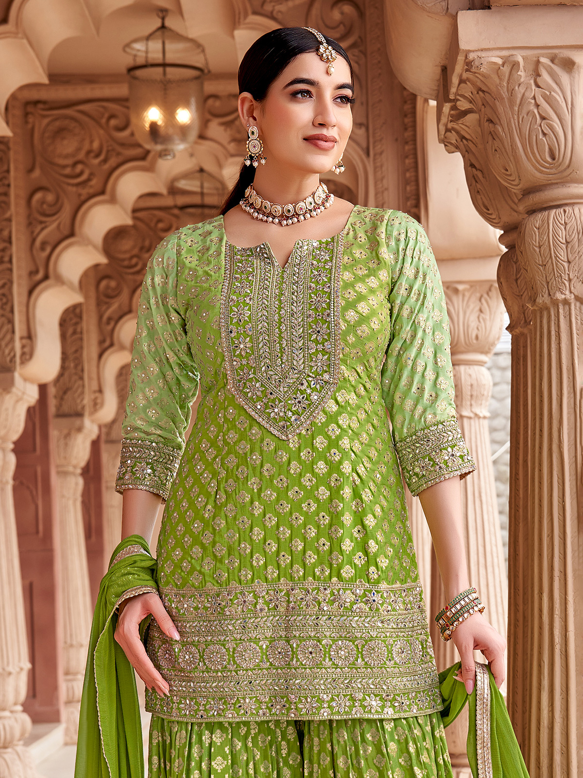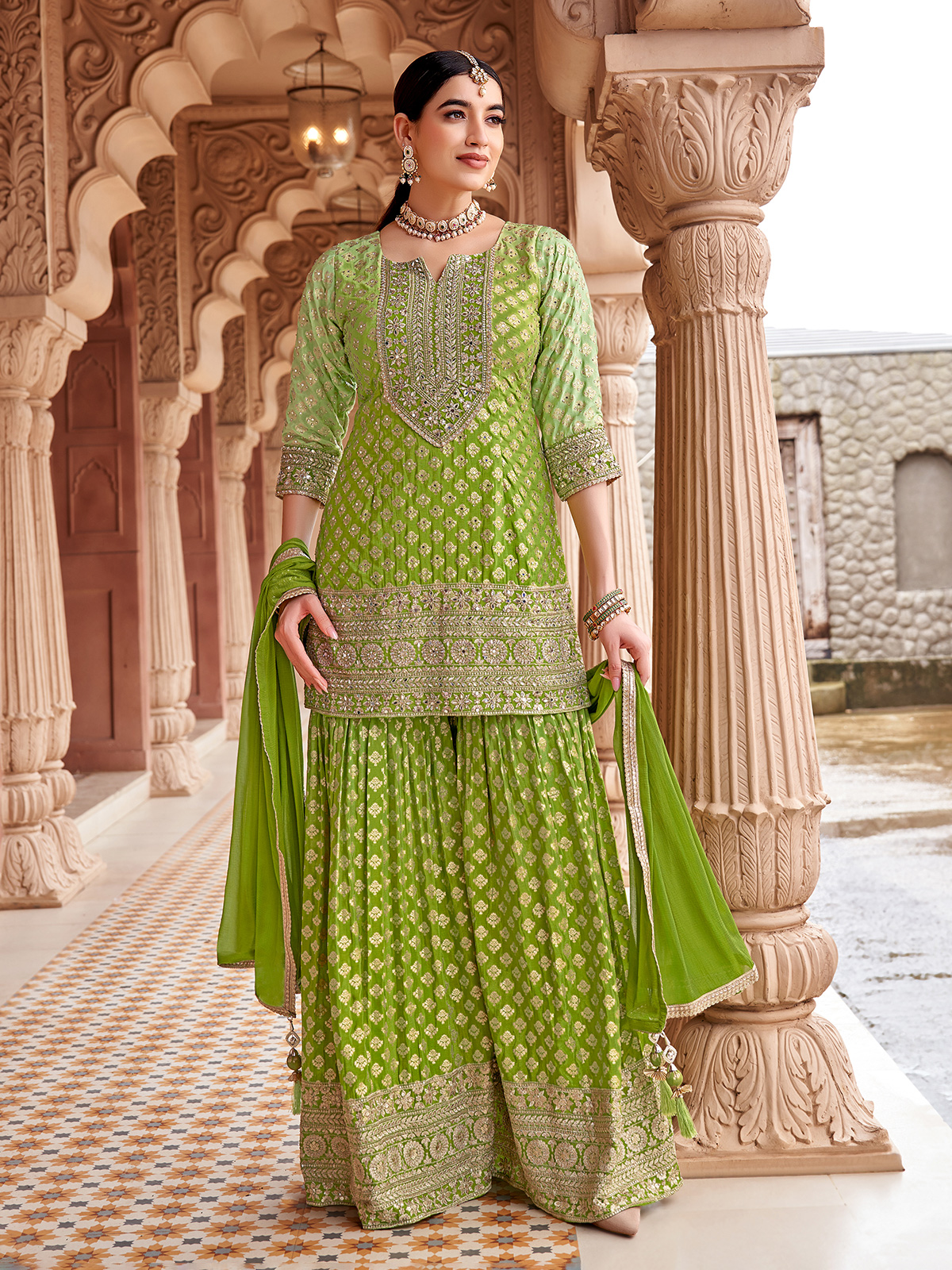 Green Silk Pakistani Sharara Outfit With Dupatta