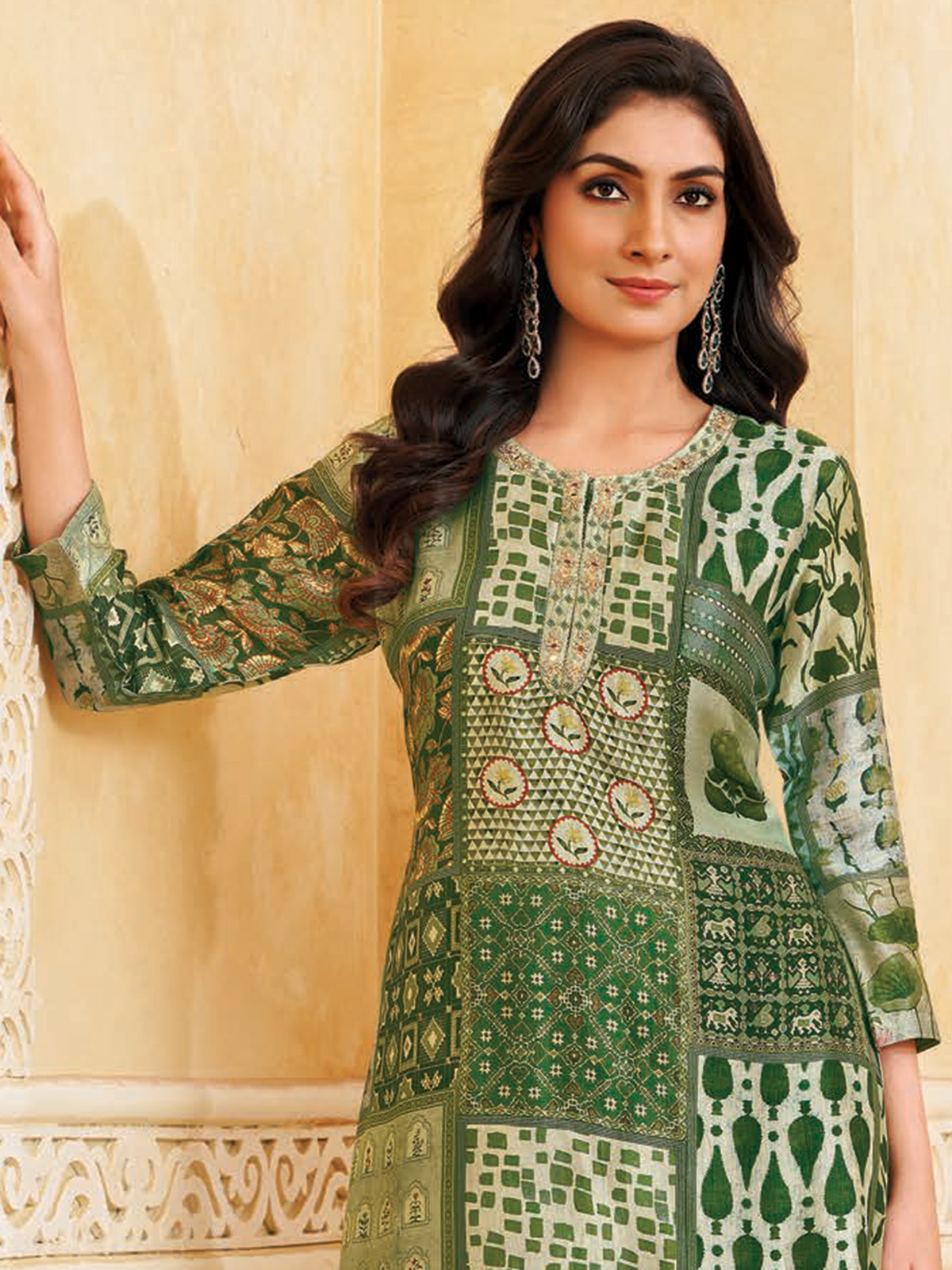 Green silk salwar suit embraces celebration with its captivating prints, round neckline, and quarter sleeves. Sleek pants enhance its modern grace, while the rich color adds festive warmth. Ideal for Diwali nights and traditional gatherings, it balances sophistication with contemporary festive style.