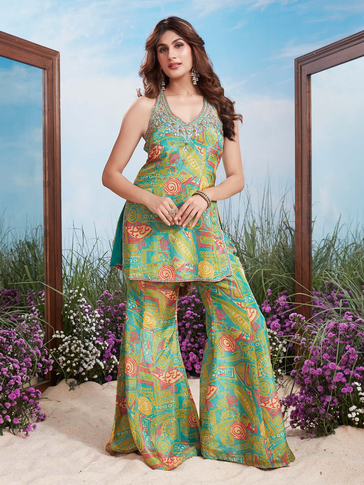 Crafted in vibrant green silk with printed fabric, this kurta features sequins, beads, and cutdana embroidery. Sweetheart neckline, sleeveless styling, and palazzo bottoms create a flowing, festive silhouette. Perfect for weddings, festive gatherings, and reception events, this ensemble combines modern elegance with intricate traditional embellishments for a stunning celebratory look.