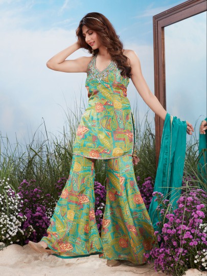 Green Silk Printed Palazzo Partywear Ensemble