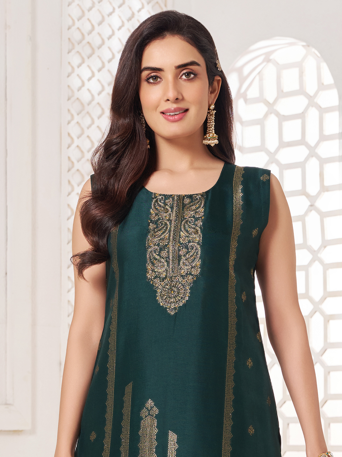Shine bright in this green silk salwar suit, designed to elevate your beauty and confidence. The round neck and sleeveless design are intricately embellished with zari, cutdana, zardosi and sequins work. Ideal for Mehendi and festival occasions, it includes a matching pant and dupatta for a complete, traditional yet stylish look.