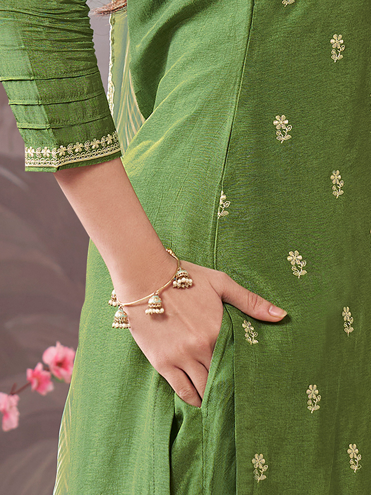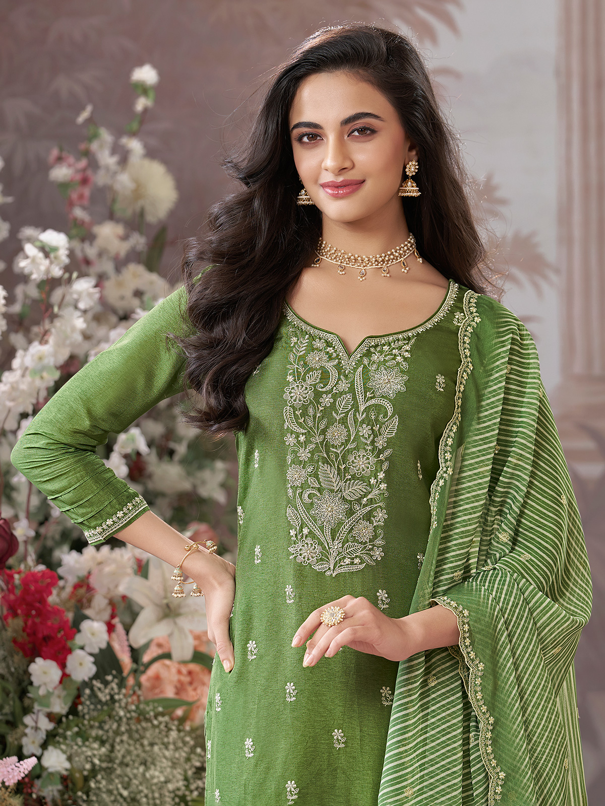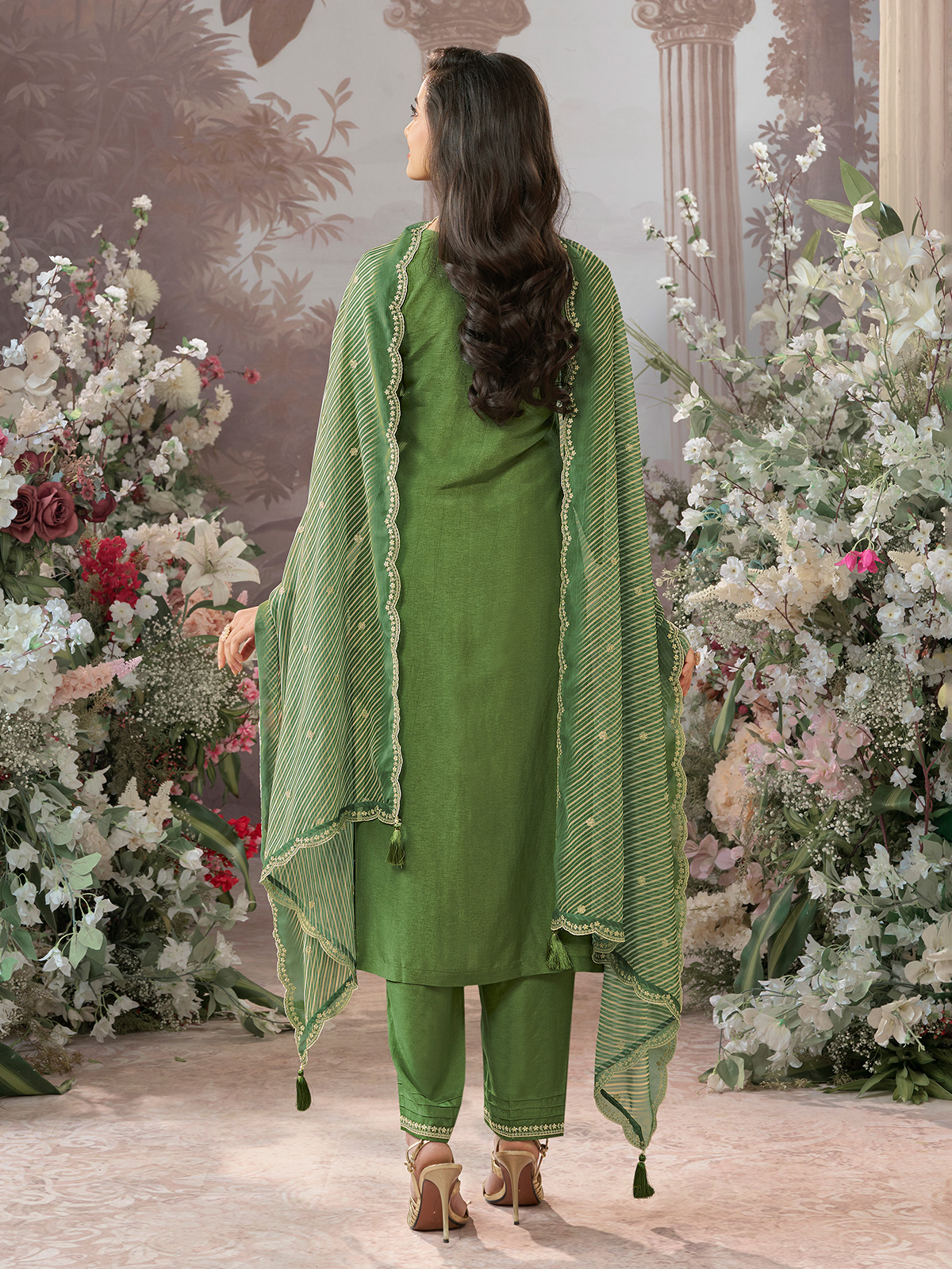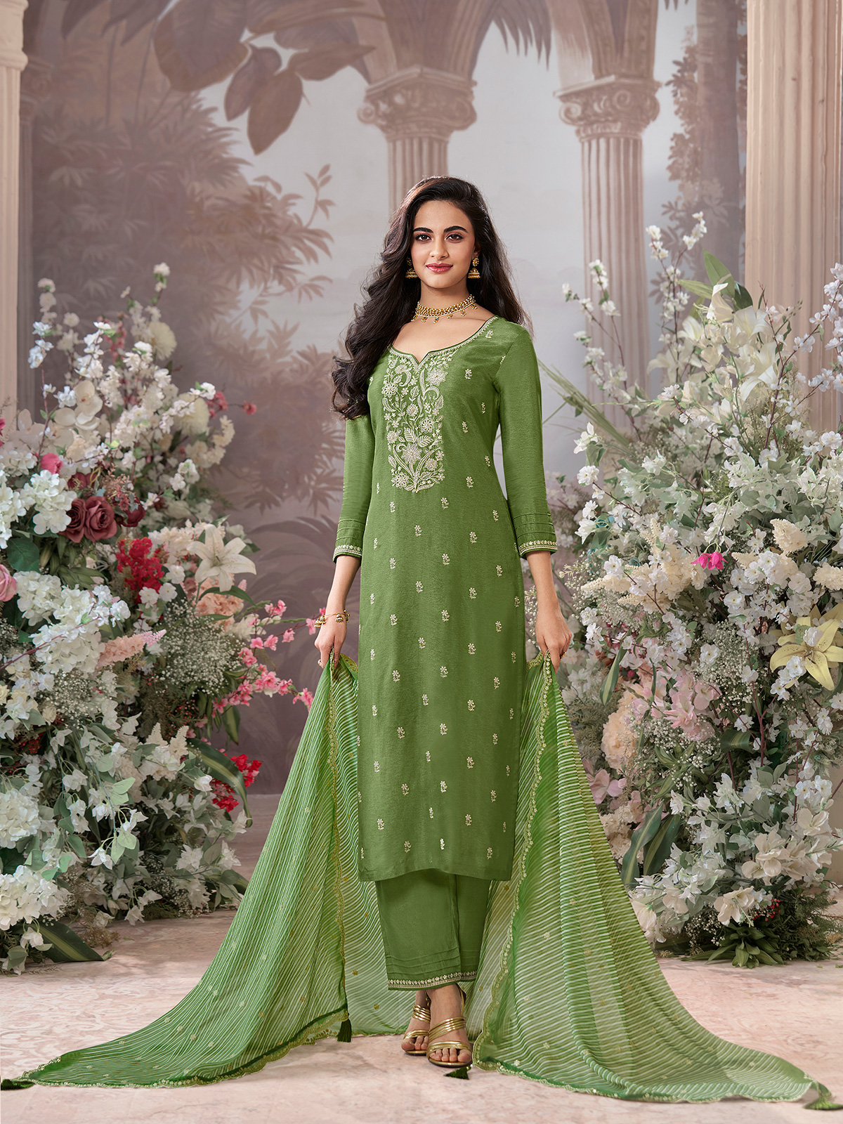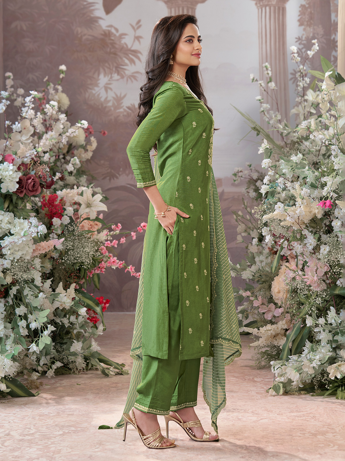 Green Silk Salwar Suit With Printed Dupatta For Women