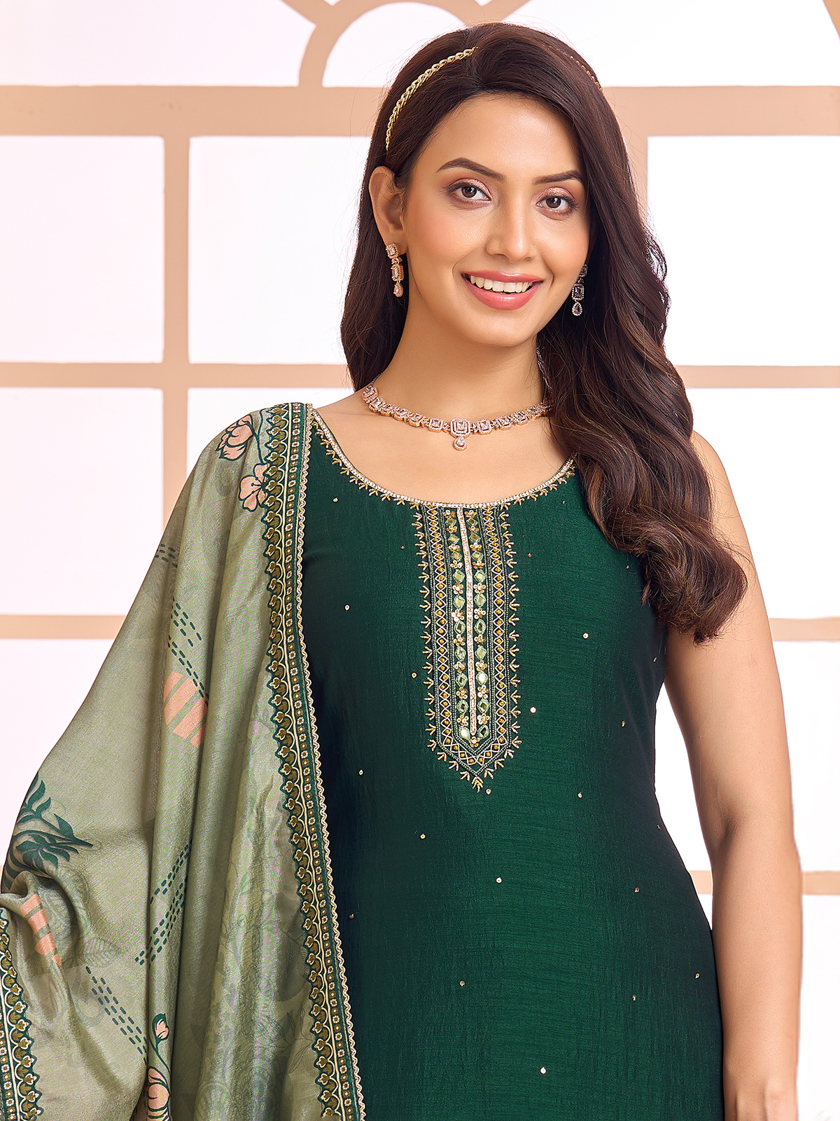This green silk straight cut salwar suit. Showcases intricate thread, mirror, sequins, beads, cutdana and zardosi embellishments. Designed with a round neckline and sleeveless silhouette, it is paired with a pant and dupatta, ideal for weddings and sangeet functions.