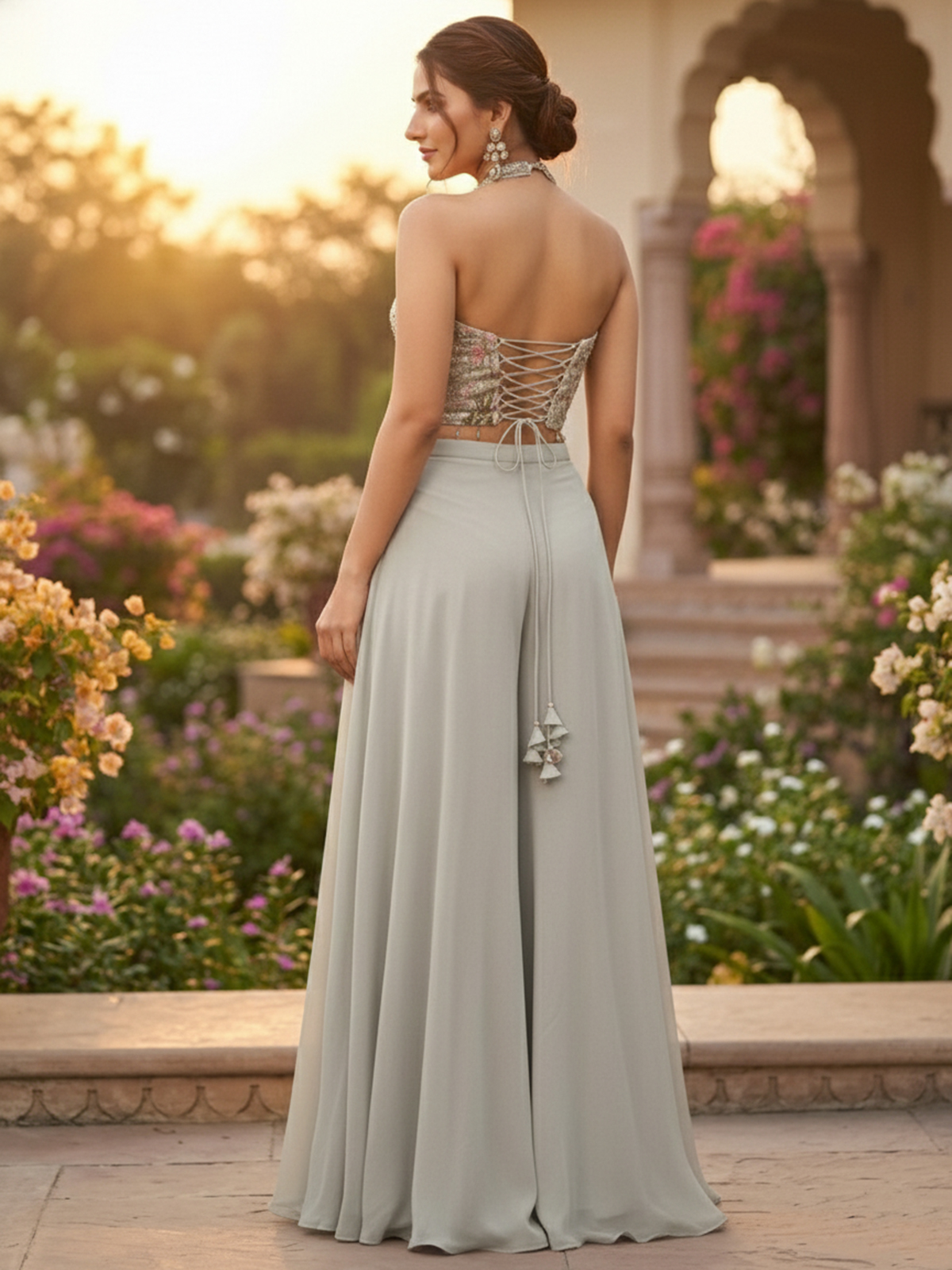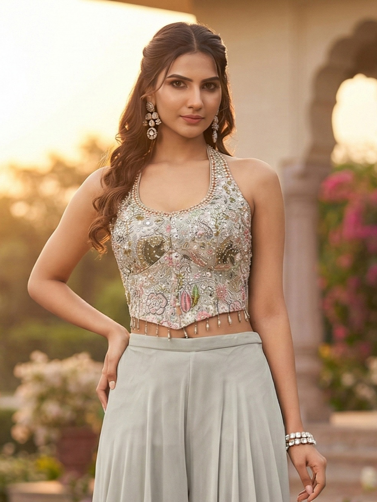 Elegant and contemporary, this grey georgette palazzo suit is designed for graceful festive styling. The sleeveless U-neck kurti is detailed with stone, pearls, beads, sequins, thread and cutdana embellishments that add subtle shimmer. Paired with a flowing palazzo, this ensemble is ideal for weddings and reception celebrations.