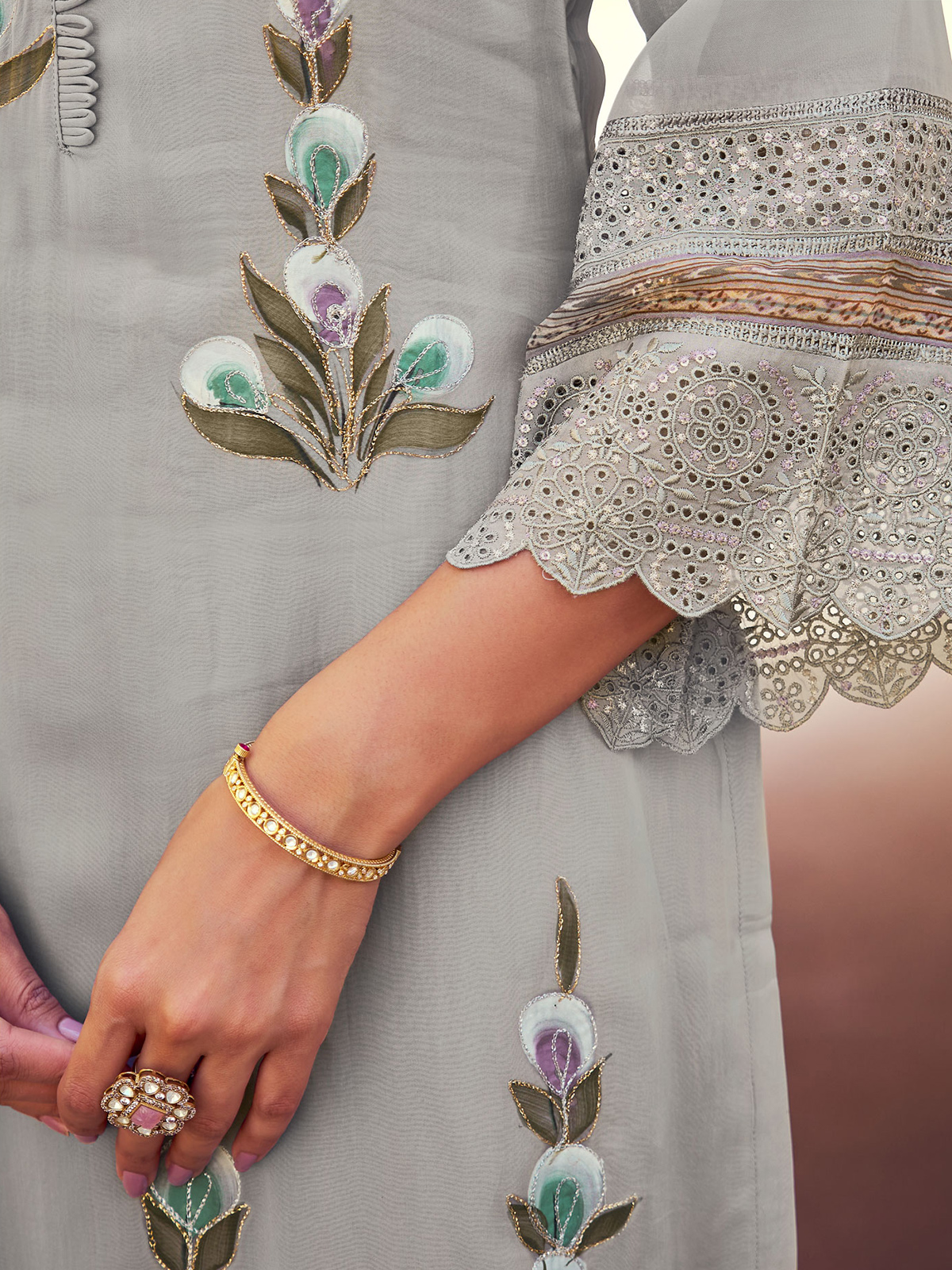 Subtle sophistication meets ethnic charm in this grey salwar suit, enhanced with traditional embroidery. The V neckline and quarter sleeves offer a graceful silhouette, elevated by a contrasting printed dupatta.