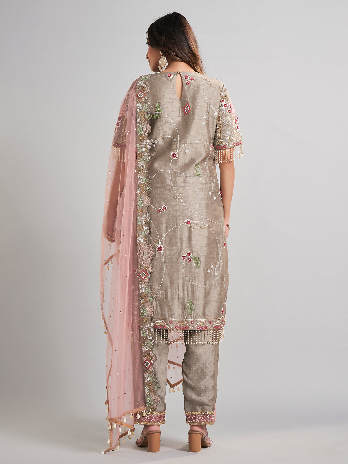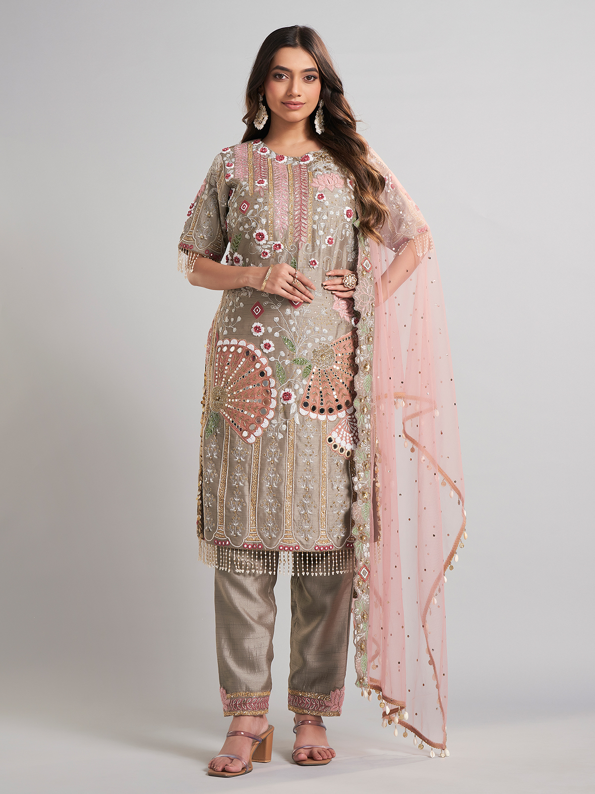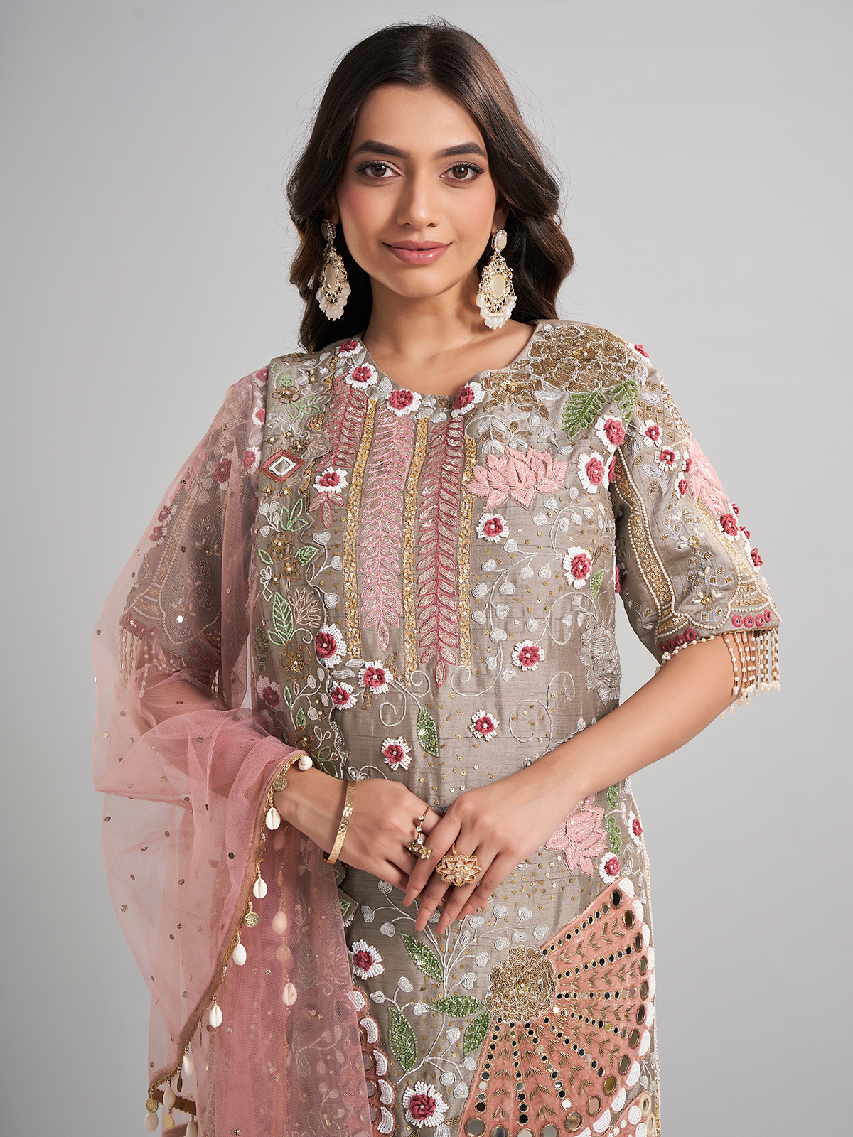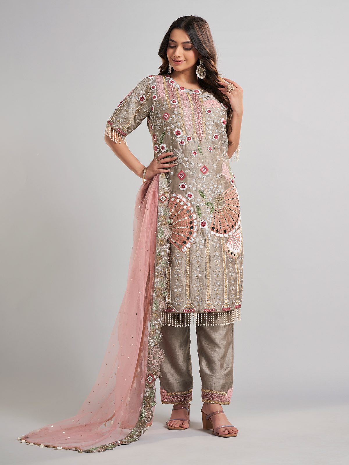 Grey Silk Pakistani Salwar Suit With Dupatta
