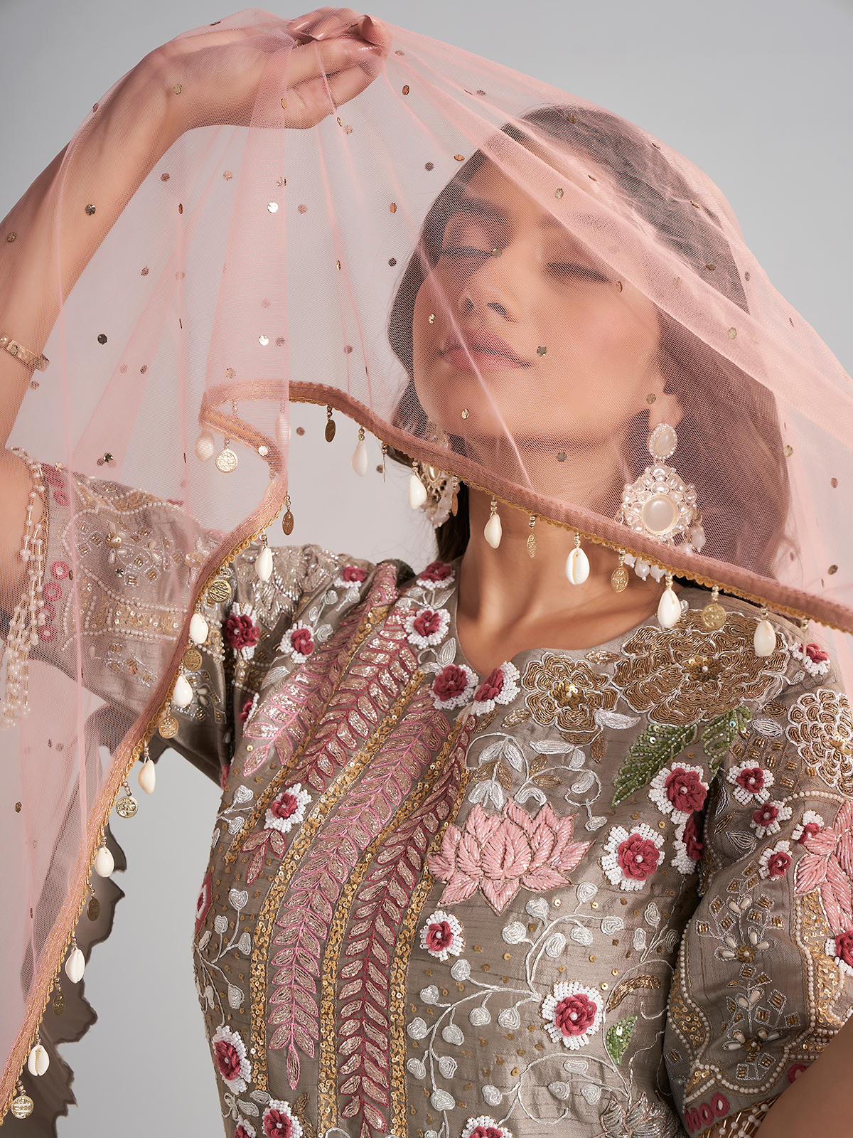 Grace your celebrations in this grey Pakistani silk salwar suit, styled with a round neckline and elbow sleeves. Enhanced with cutdana, sequins, beads, pearls, aabla, thread, and zardosi, it comes with a dupatta. A wedding-perfect attire radiating timeless charm and festive allure.