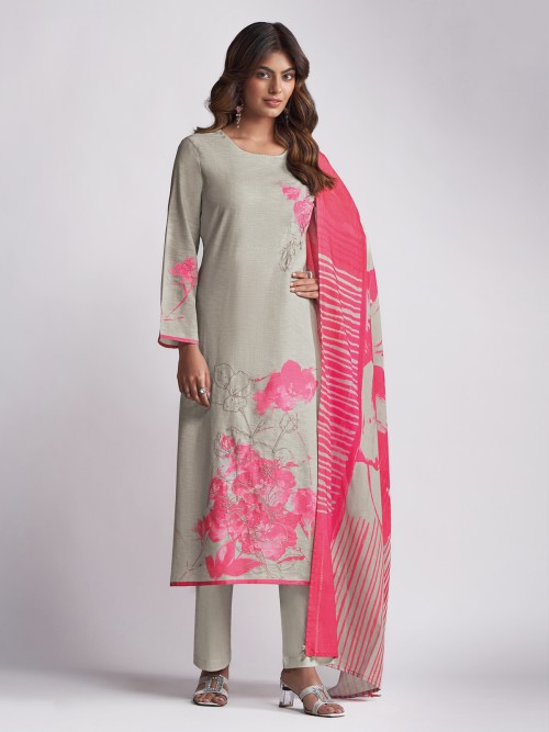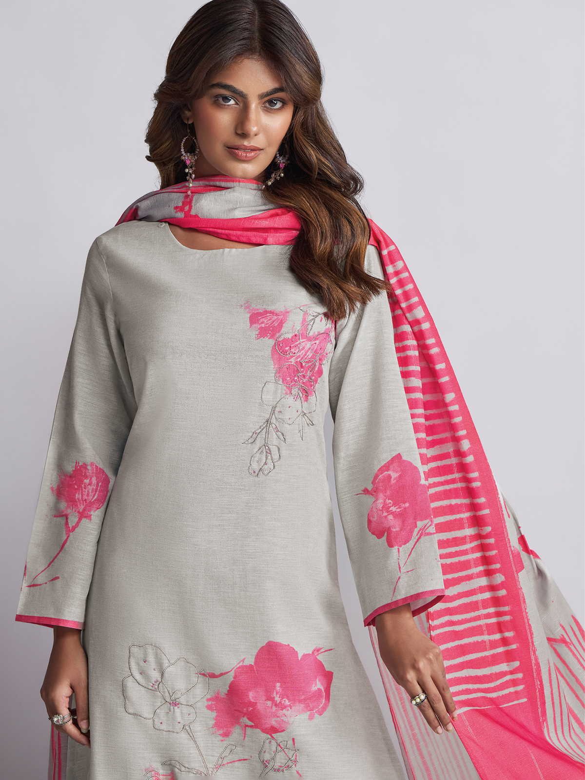 Celebrate tradition in this elegant grey salwar suit with detailed thread and sequin embroidery on soft linen cotton. A round neckline, quarter sleeves, and pant and dupatta offer a festive yet graceful look.