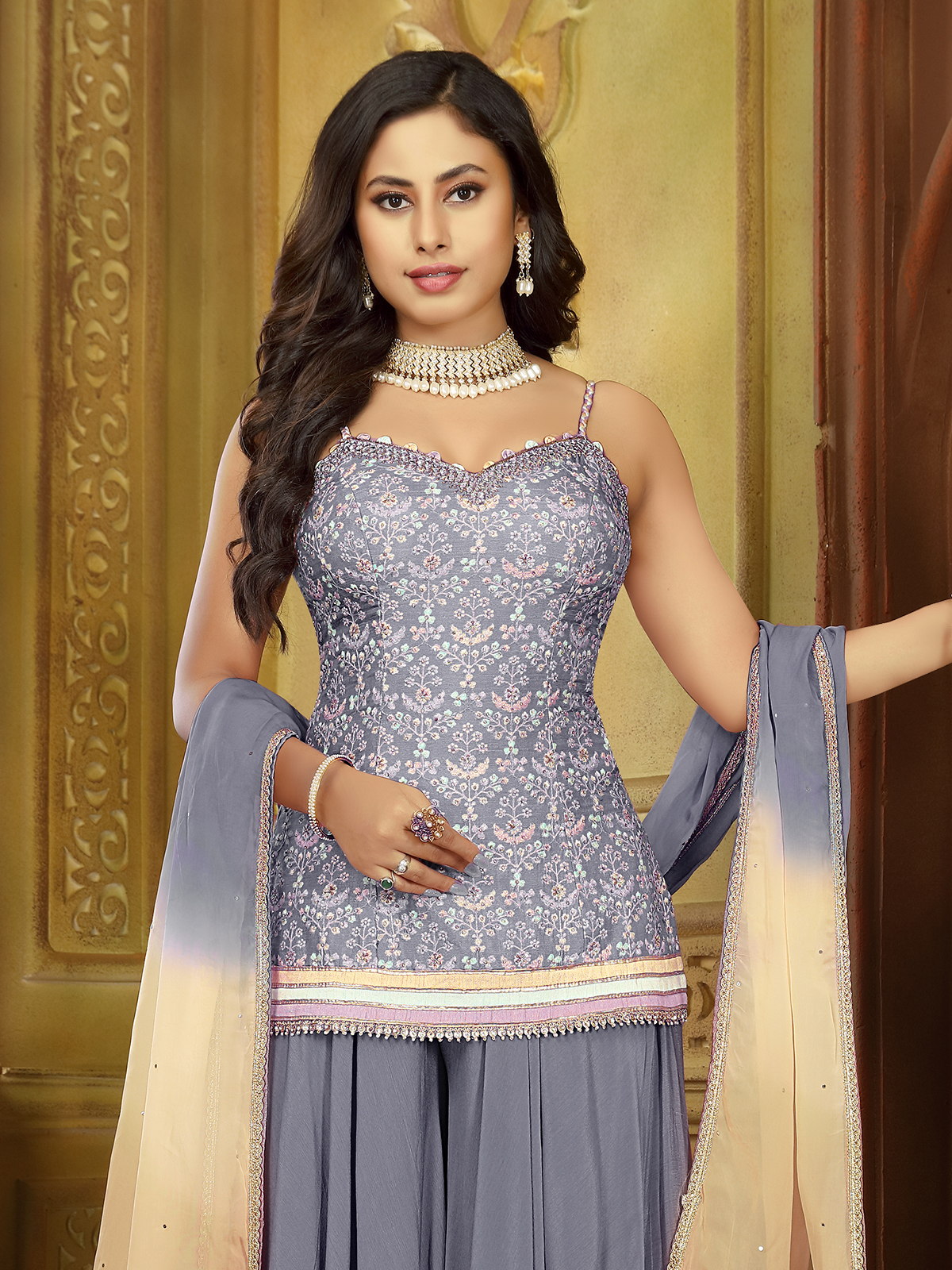Draped in soothing grey silk, this printed palazzo suit sparkles with aabla, cutdana, stone, thread, sequins, and zardosi accents. The sleeveless kurta adds a touch of modern elegance, paired beautifully with a breezy palazzo and a light dupatta ideal for refined festive and wedding moments.