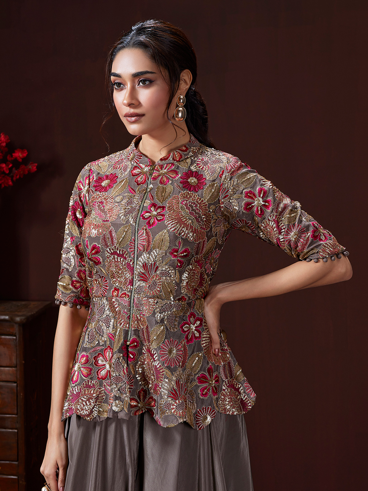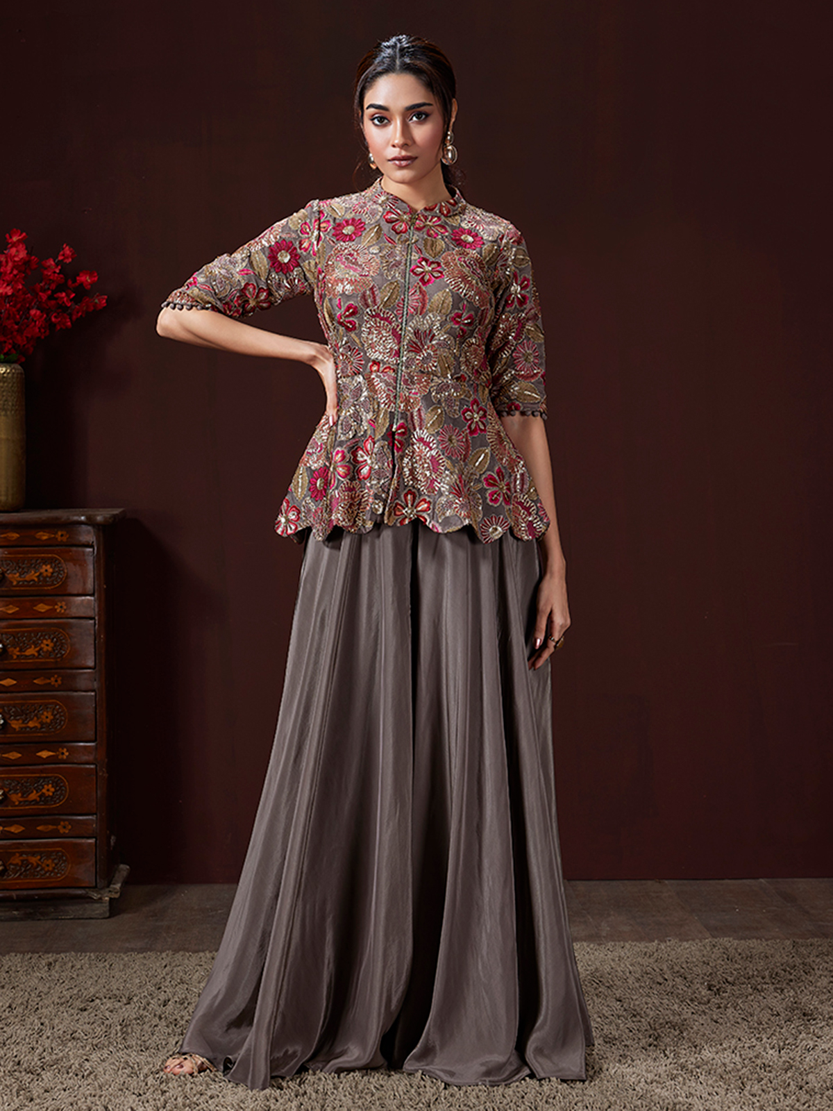 Carry quiet grandeur in grey silk, beautifully adorned with sequins, cutdana, and embroidery. A stand collar and elbow sleeves lend a refined modern touch. The palazzo pants flow with grace, giving your festive ensemble an elegant rhythm.