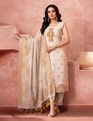 Celebrate your traditions in this white silk straight-cut salwar suit, featuring elegant embroidery, sequins, and stone embellishments. Styled with a sleeveless cut and round neck, it comes with pants and a zari-work dupatta, perfect for festive occasions.