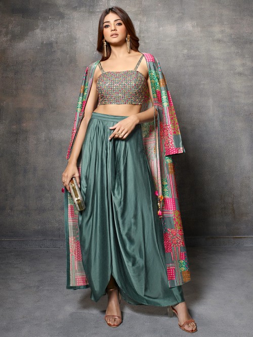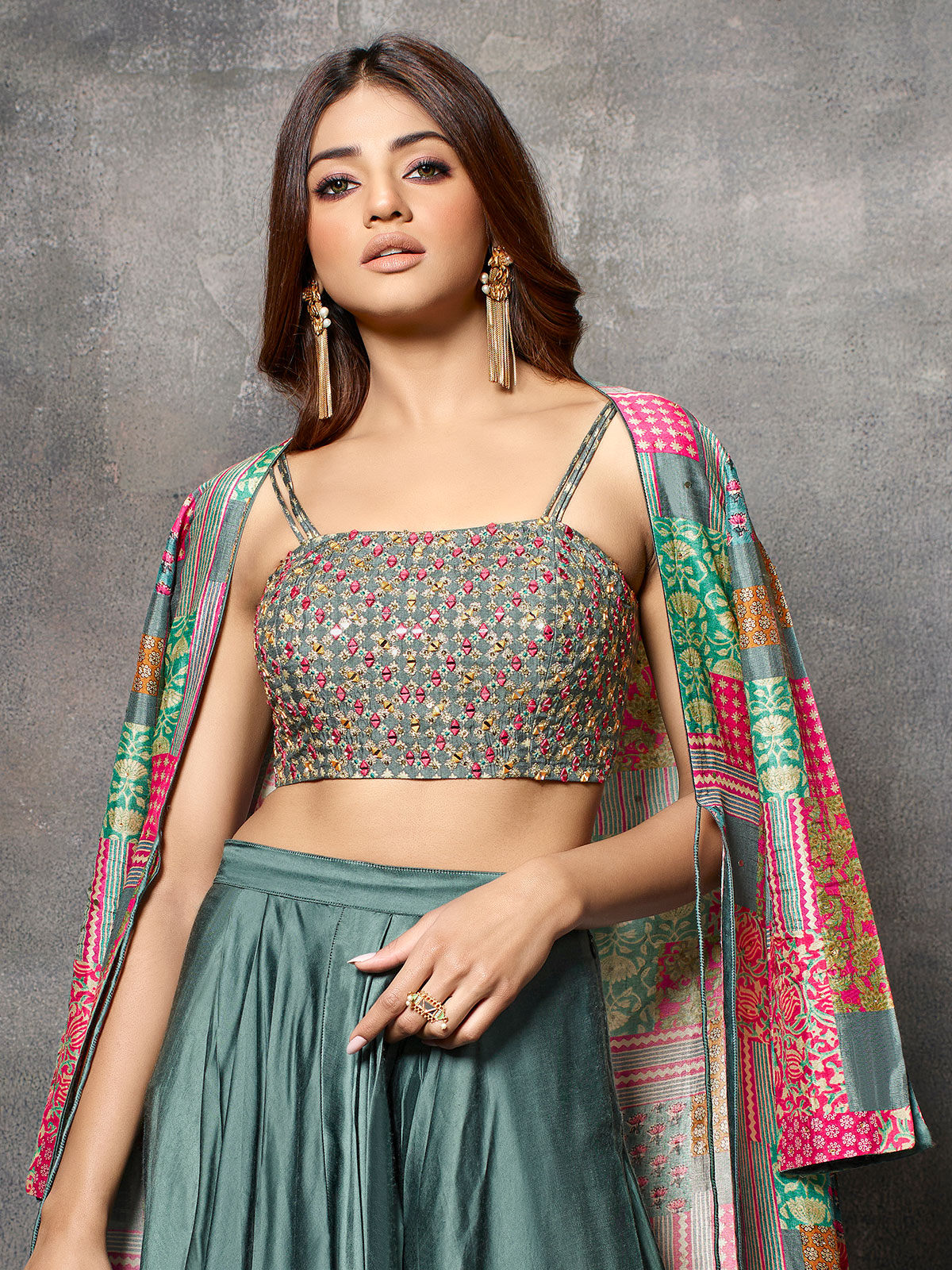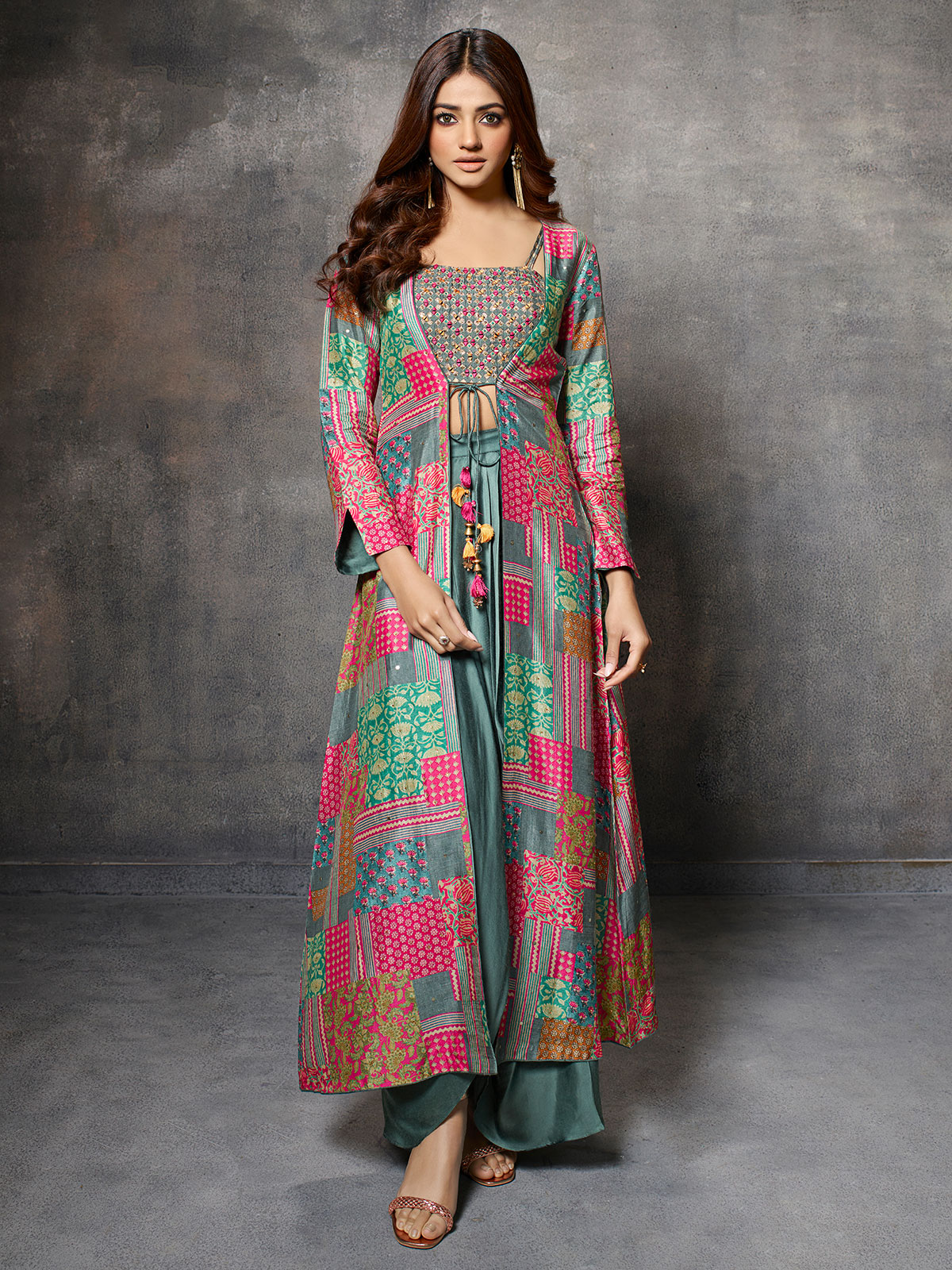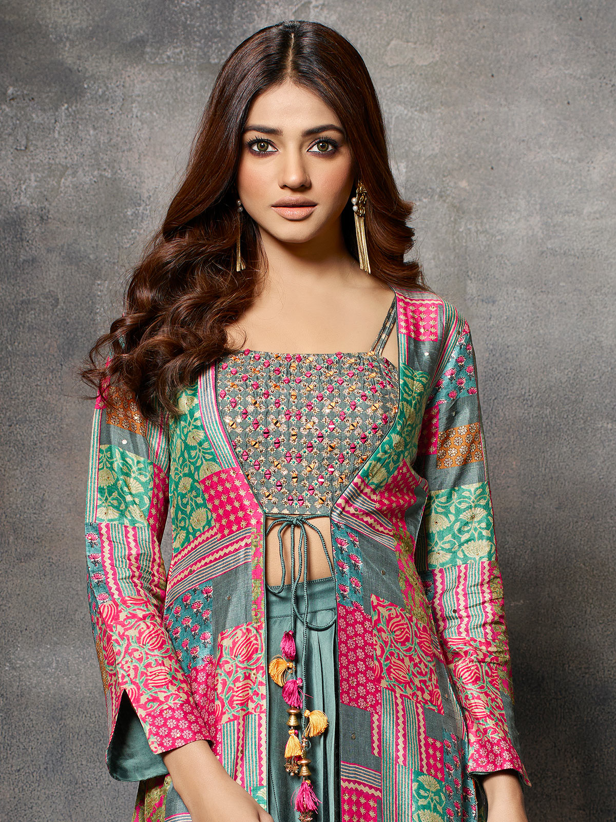 Embrace trendiness with a touch of elegance in a grey satin designer suit. The resham, mirror, sequins, and zari work add a touch of allure. Accompanied by a long printed shrug, this ensemble keeps you in sync with the latest trends.