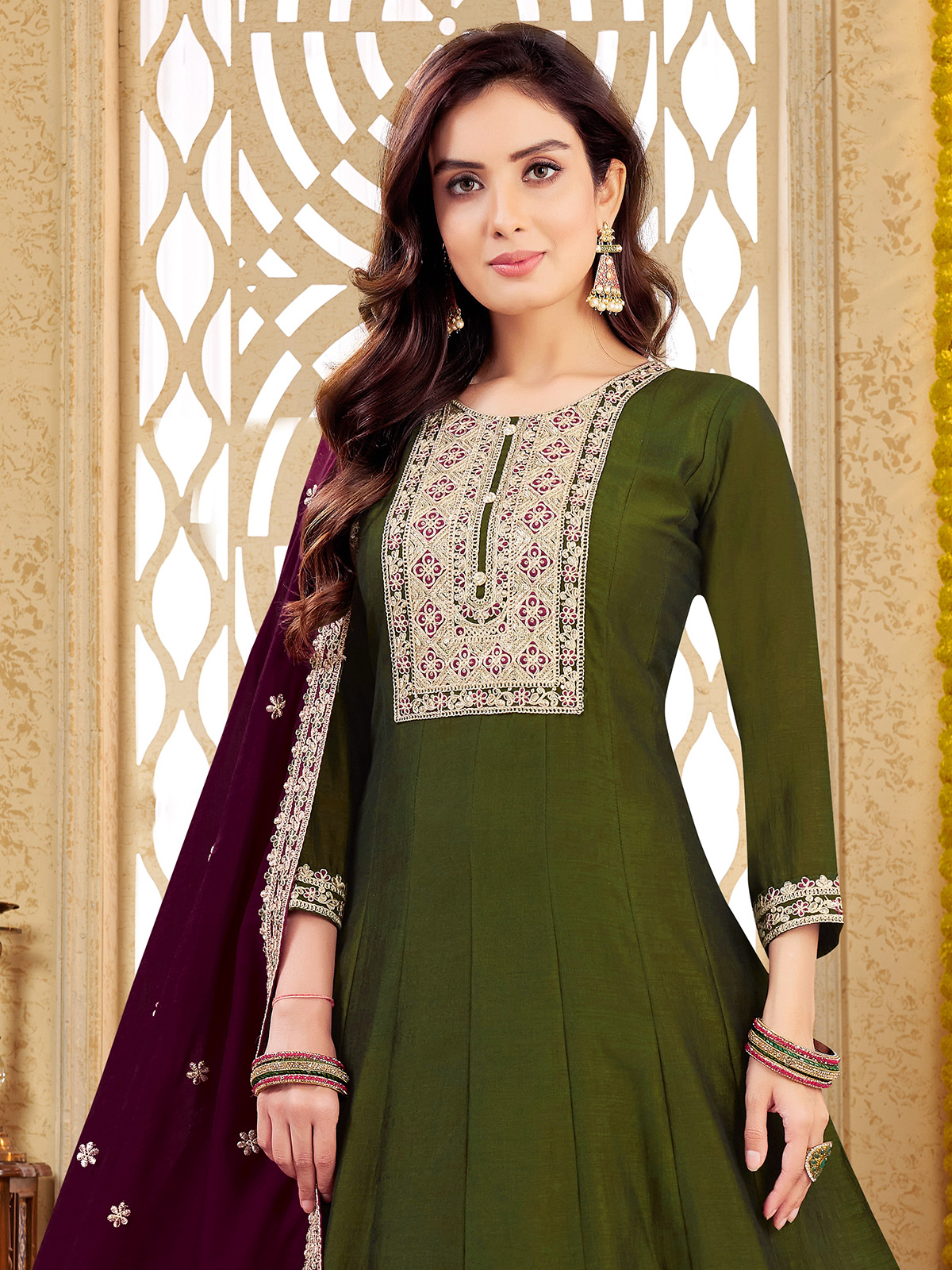Get ready for your next wedding or festive occasion with this dark green silk salwar suit, beautifully embellished with resham and sequin work. The round neckline and quarter sleeves add a touch of sophistication, while the pants and dupatta perfectly complete the ensemble.