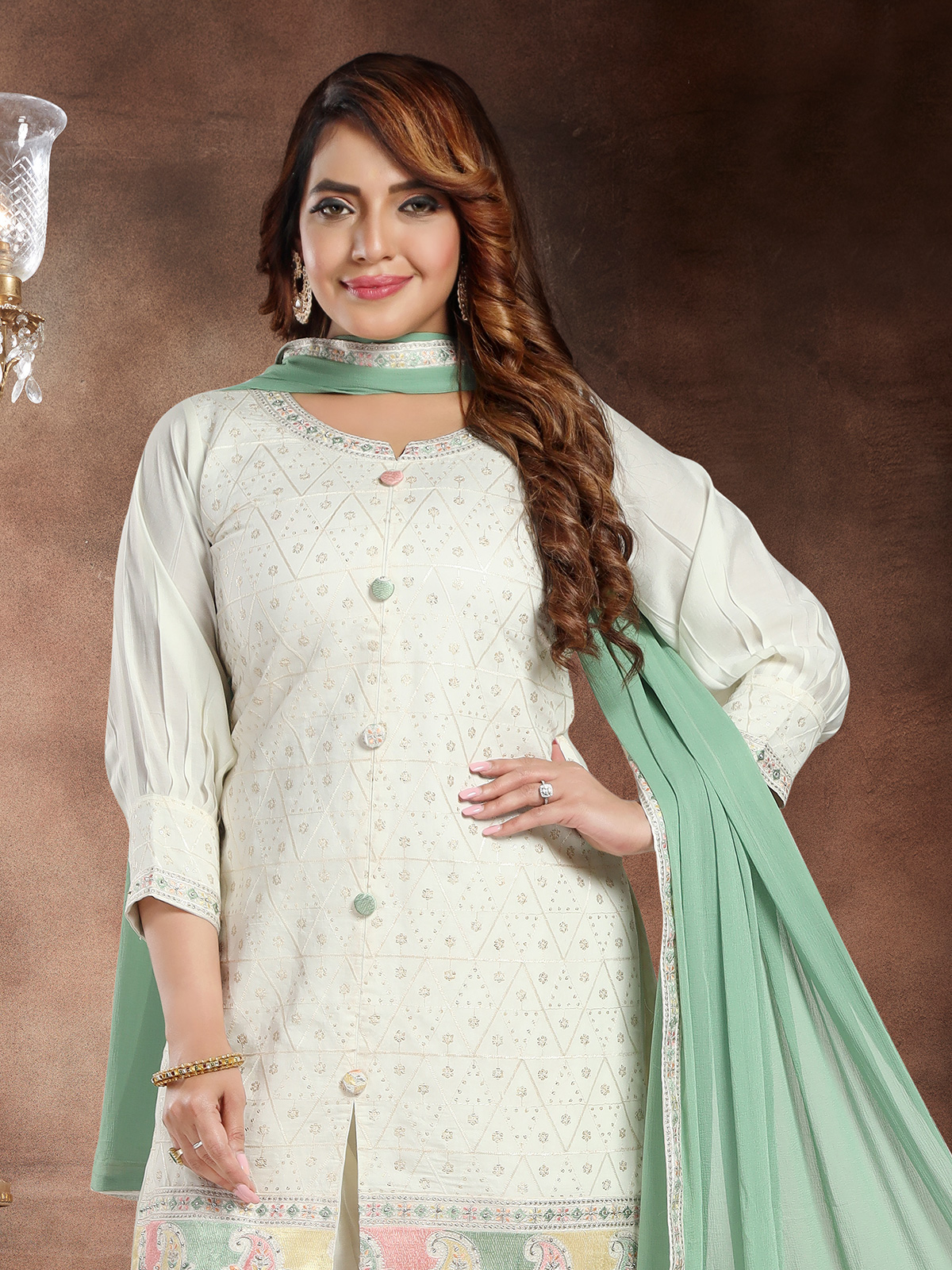An enchanting choice for a traditional event is this vibrant off-white silk punjabi style salwar suit. Comes enhanced with embroidery and sequins work, features a round neck and quarter sleeves pattern. Comes with a dupatta.