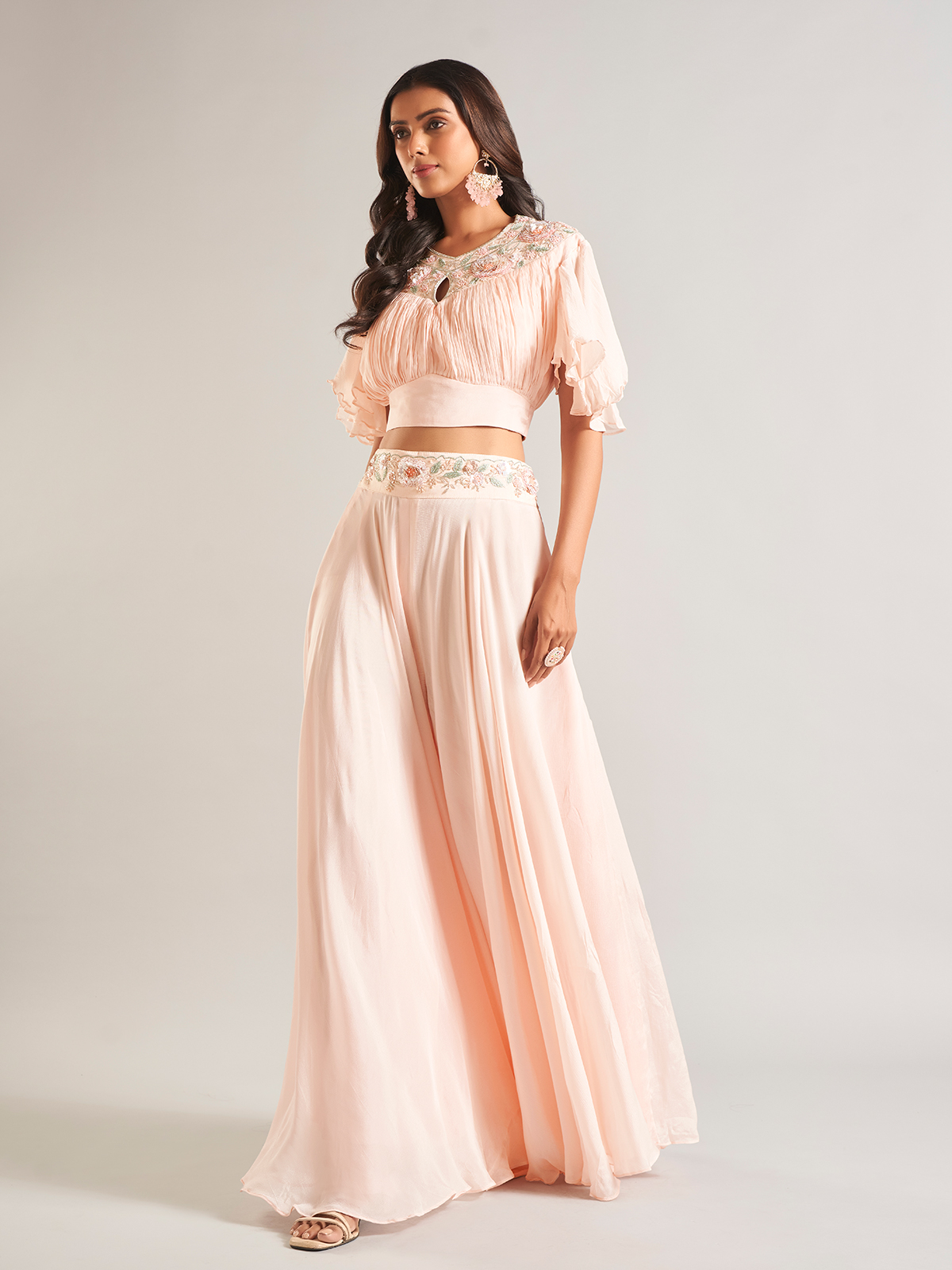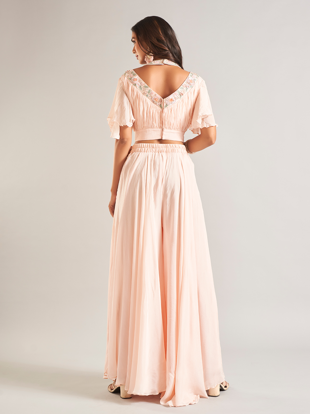 Embrace grace in this olive georgette palazzo salwar suit, adorned with sequins, cutdana and pearl work. It has a U neck and sleeveless pattern. Comes with a dupatta, this ensemble radiates timeless elegance.