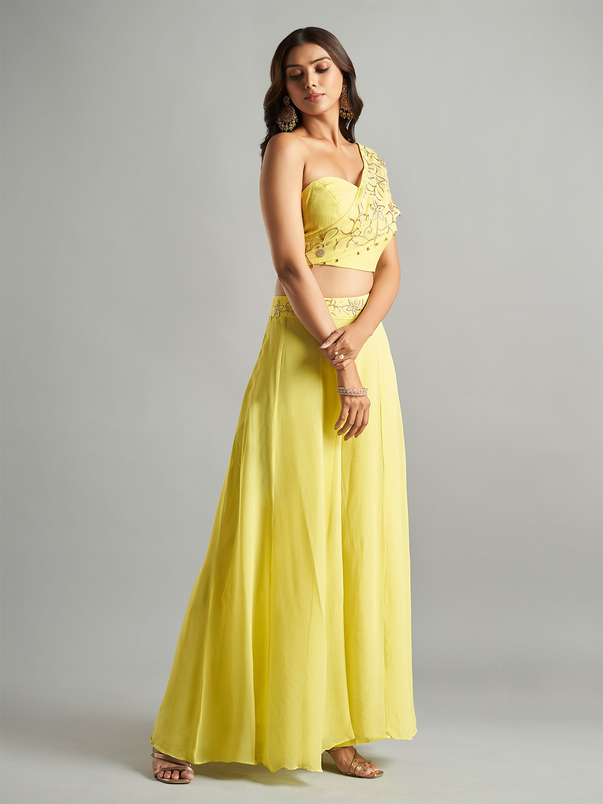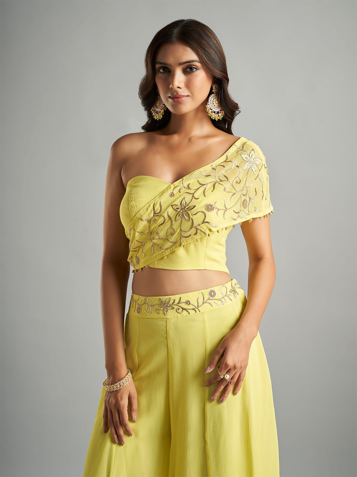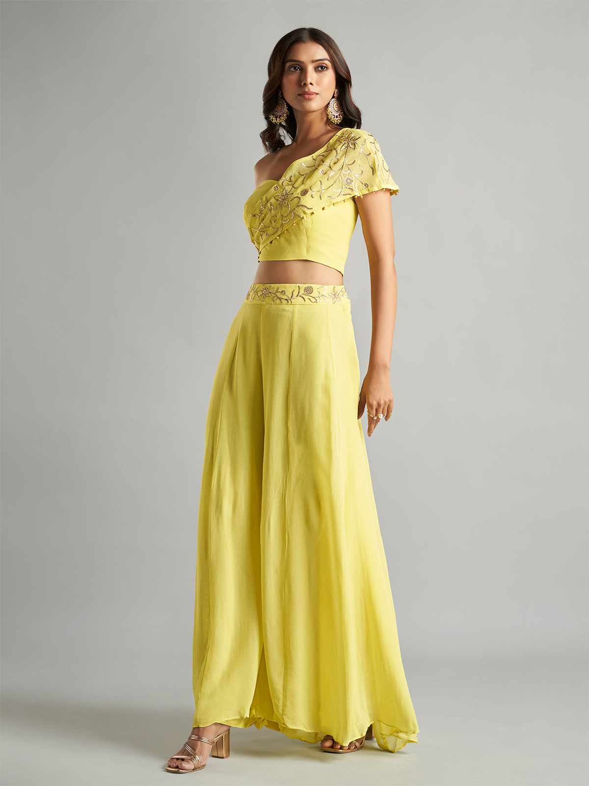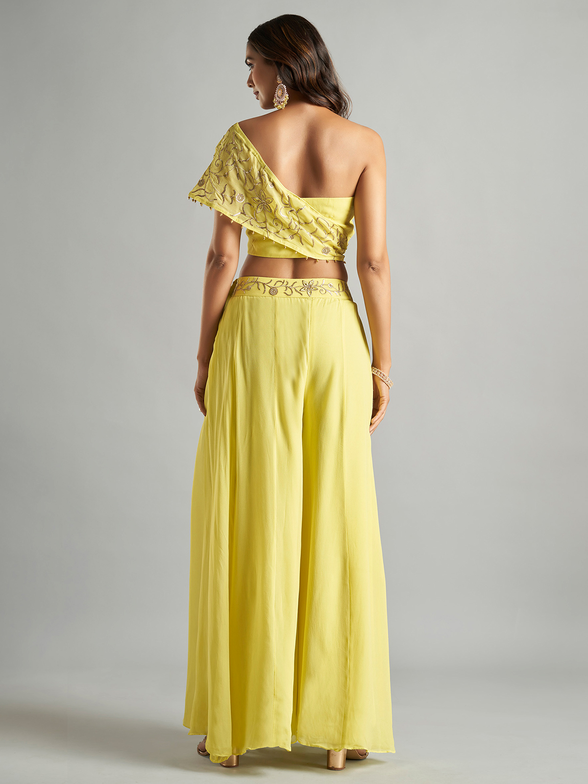 An enchanting choice for fun-filled party celebrations, this yellow georgette palazzo set will captivate hearts. Decked with intricate embroidery and sequins work design to create a truly exquisite look.