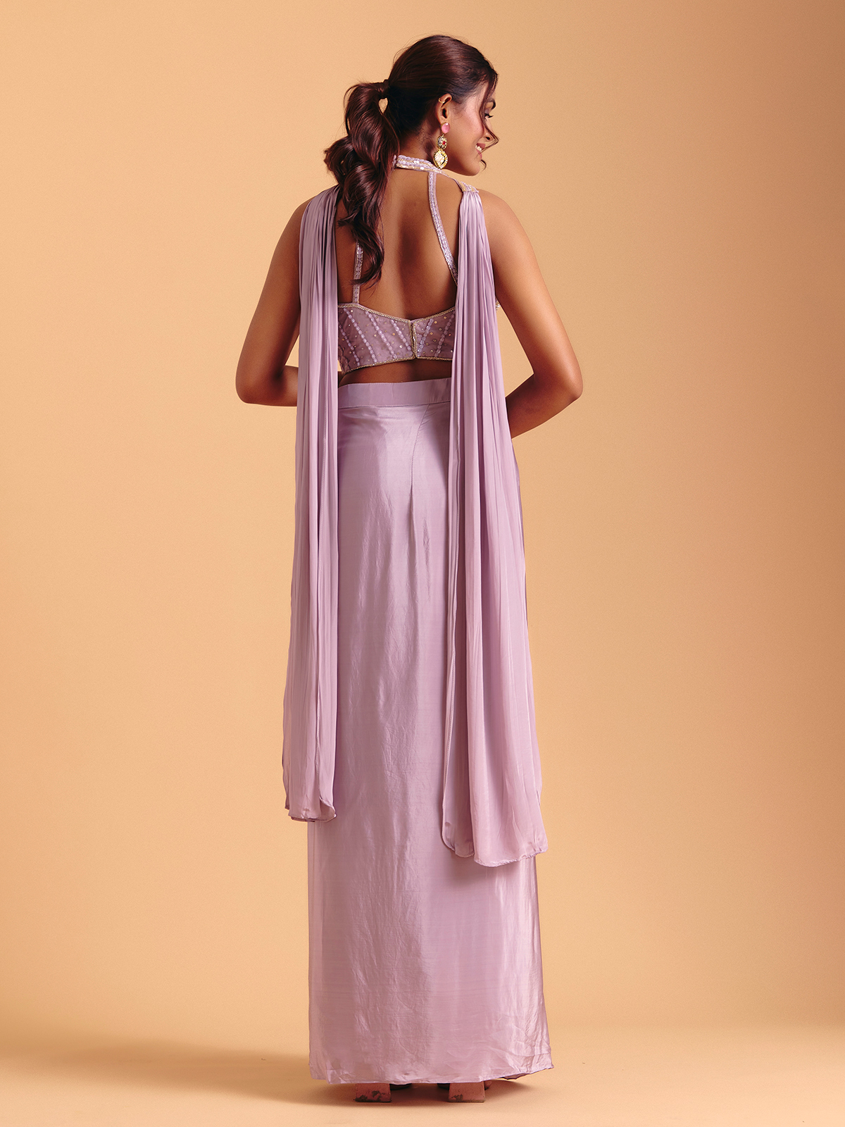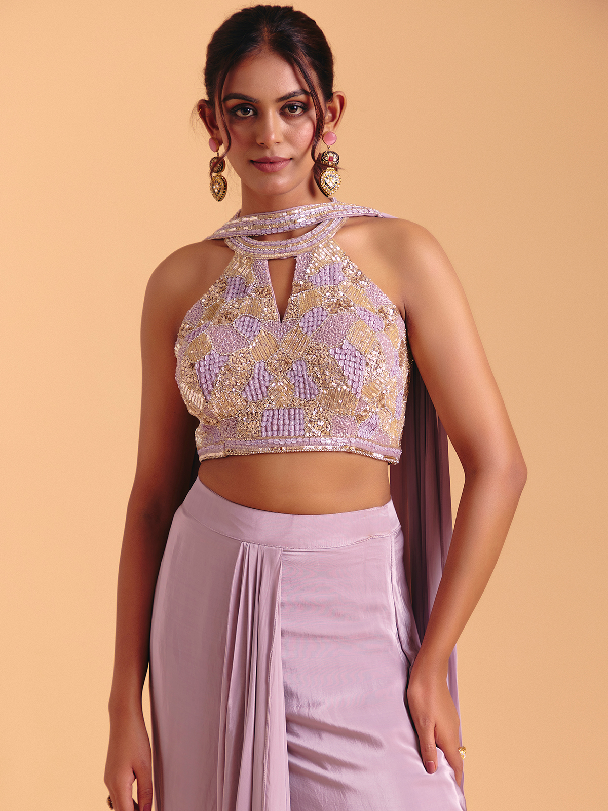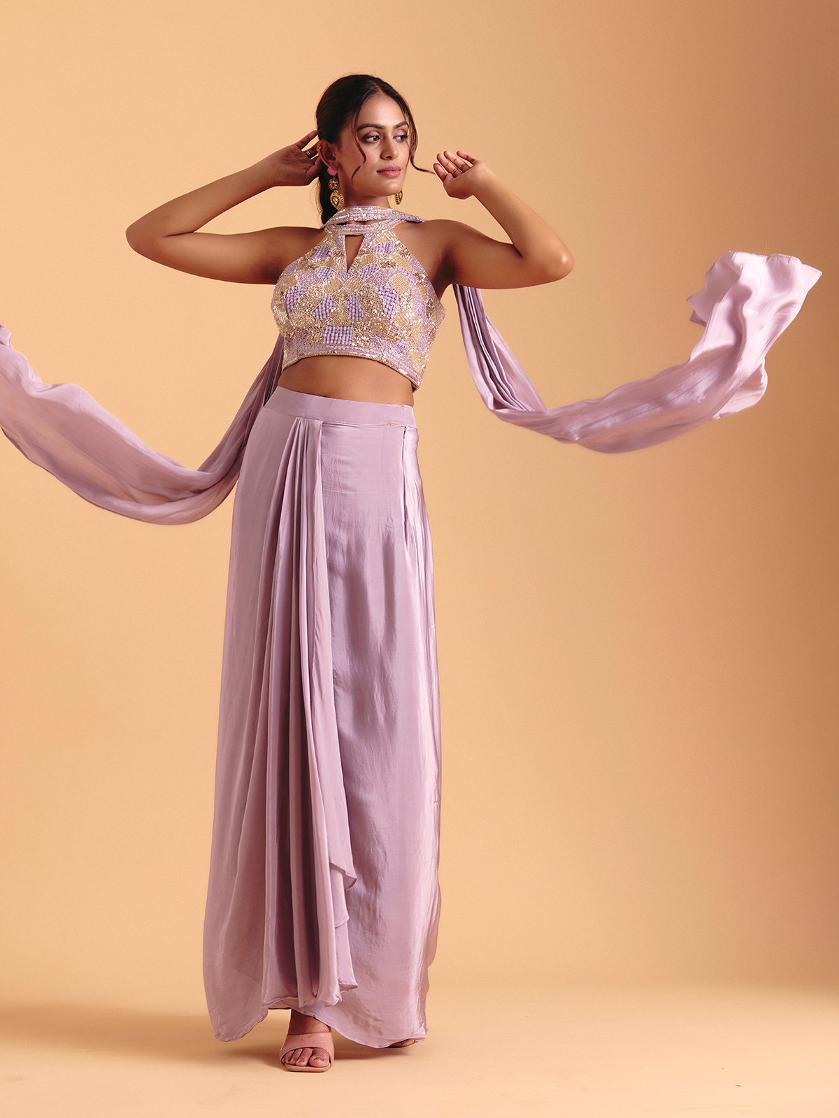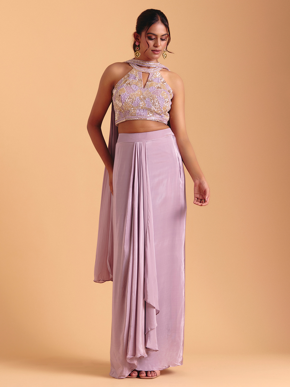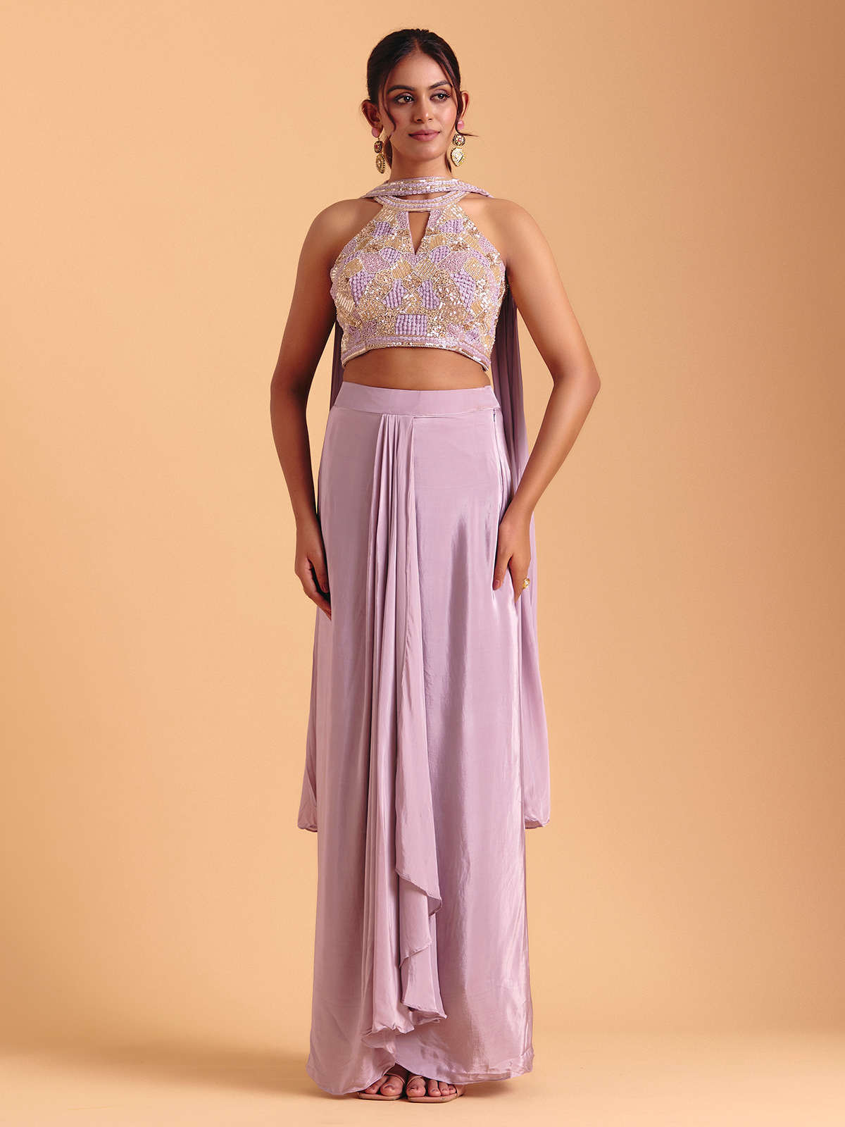 Satin silk in a delicate lavender hue elevates this Indo-western suit with luminous festive grace. Sequins, beads and cutdana add ethereal shine along the neckline and sleeveless silhouette, enhancing its poetic softness. The choker dupatta completes the set with a touch of refined elegance.