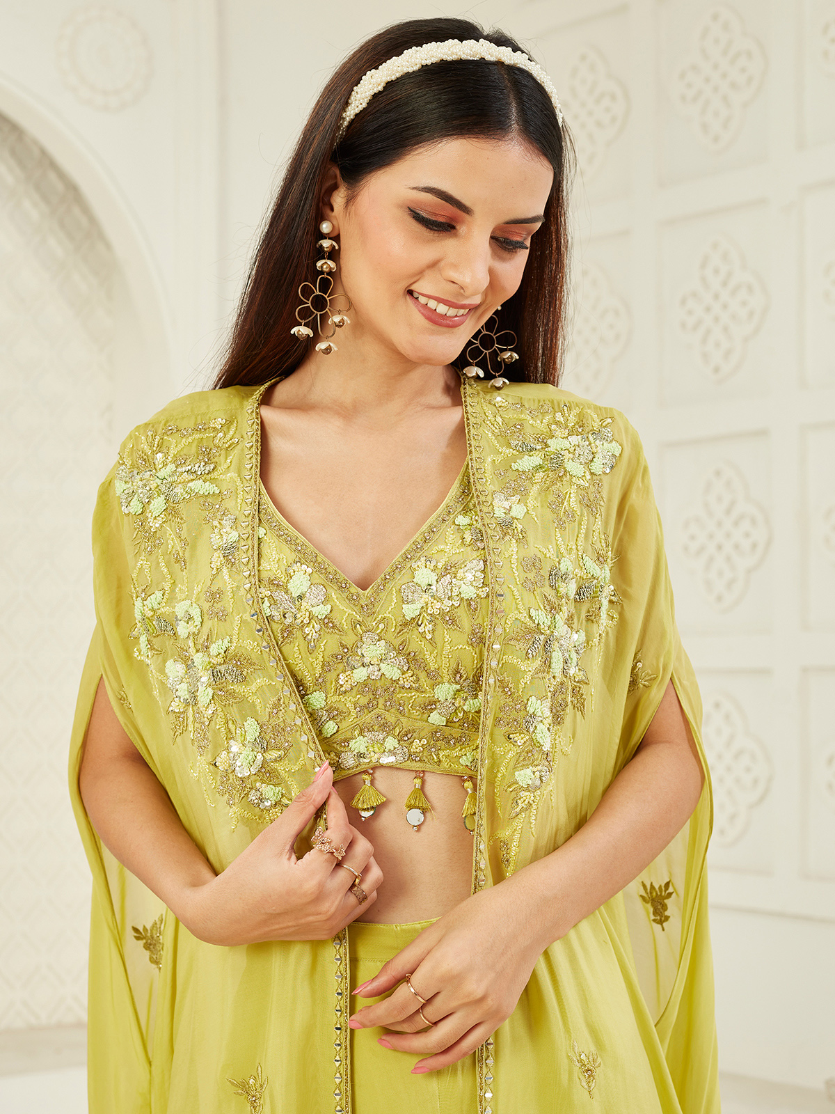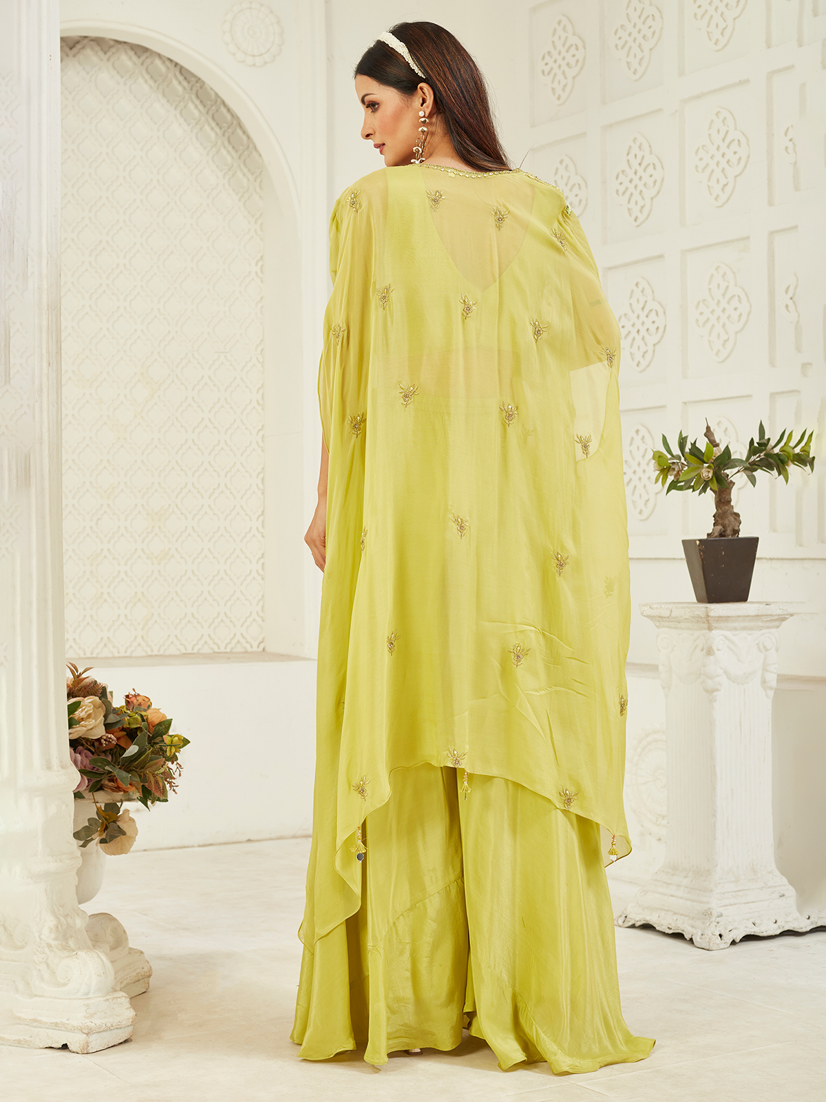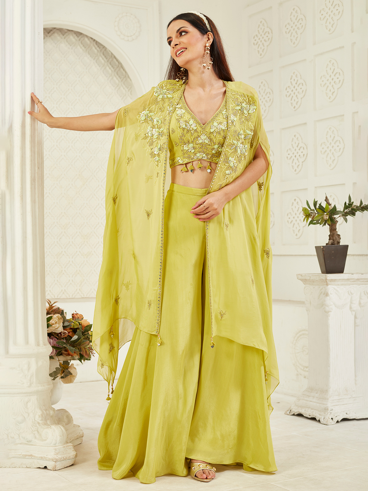 Vibrant lemon green satin silk creates a lively wedding outfit in this jacket style palazzo suit with embroidery, cutdana, sequins, stone, aabla, and thread detailing.