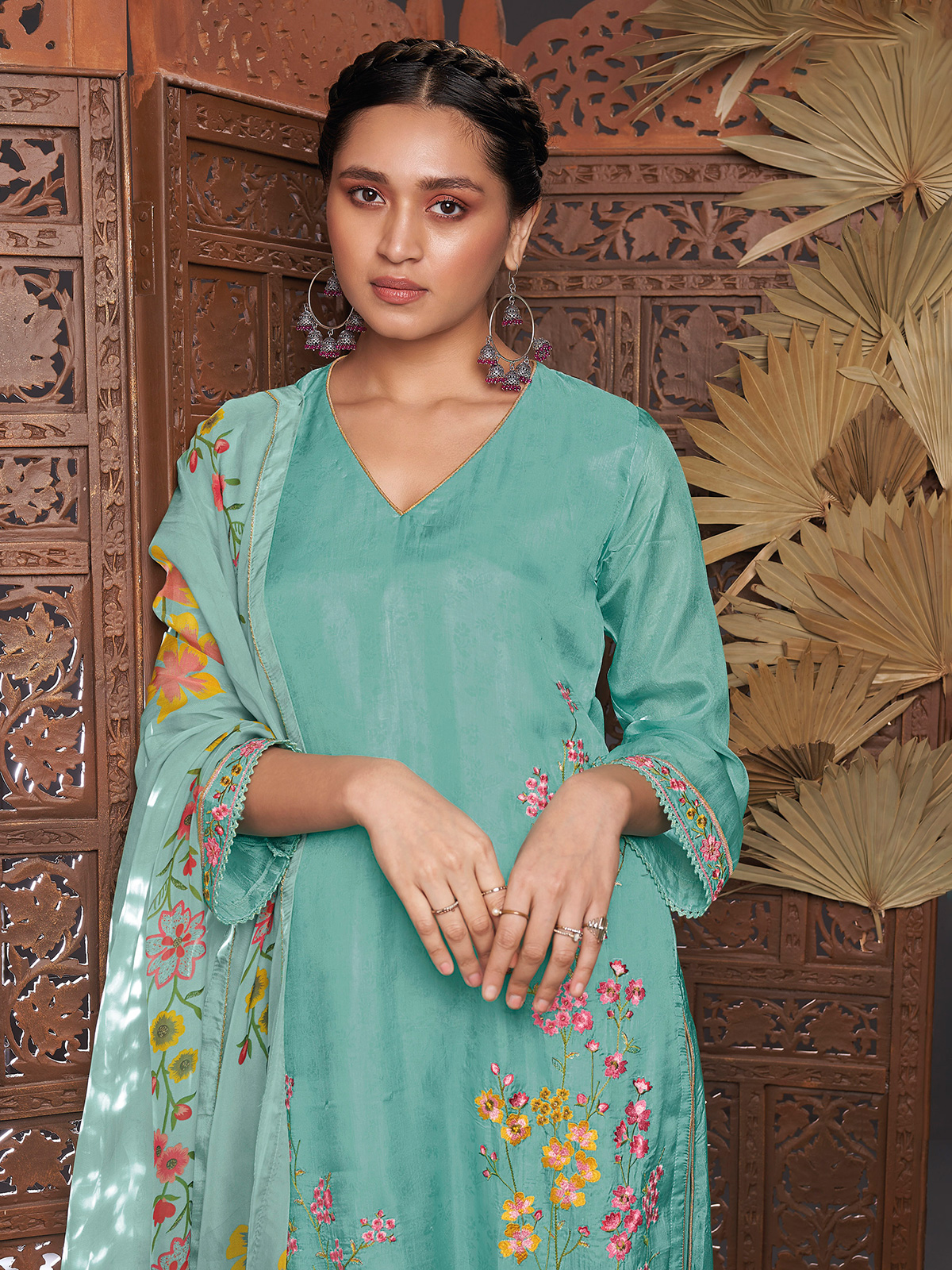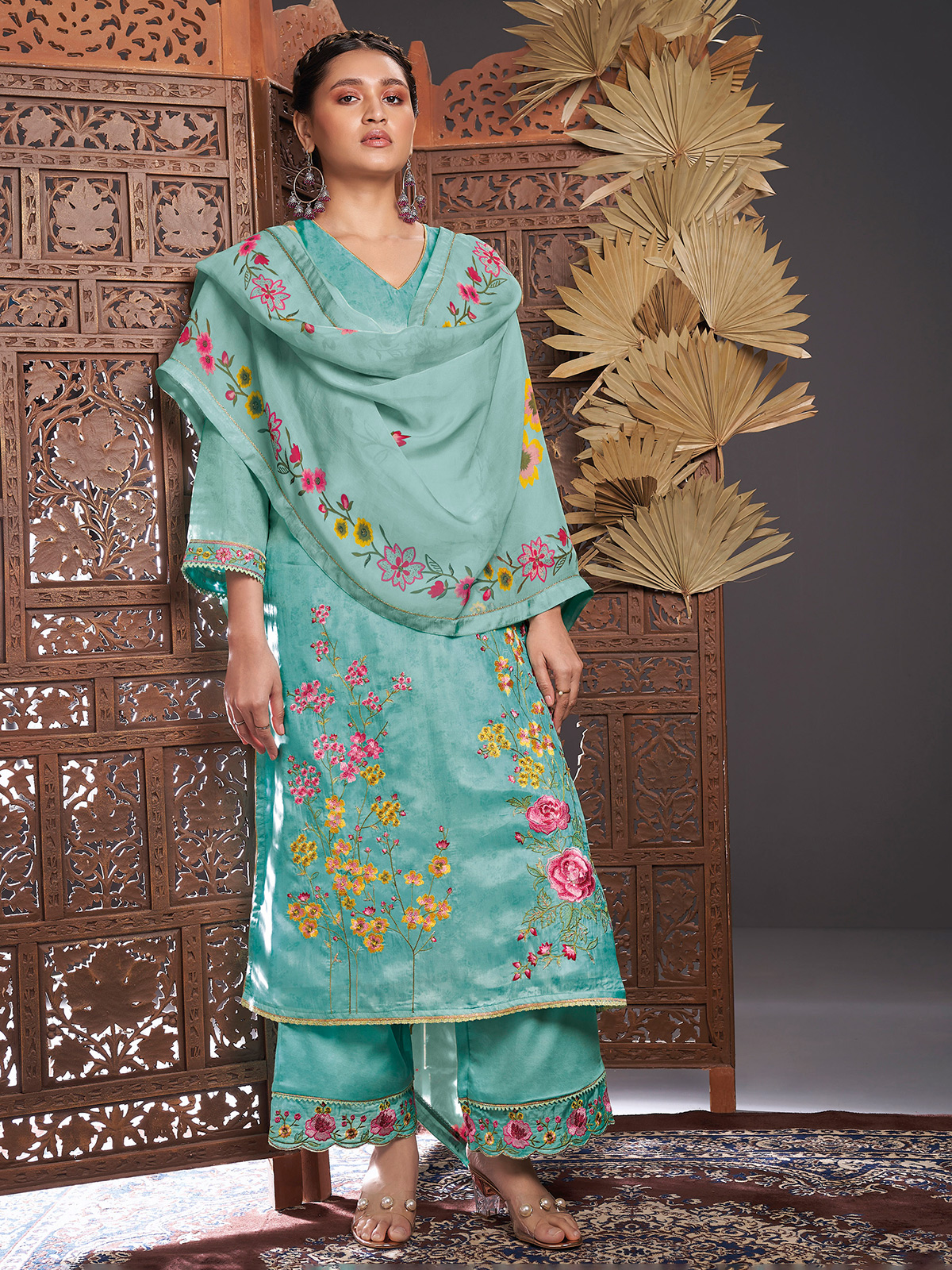 Breathe freshness into your ethnic wardrobe with this light blue silk palazzo suit. Embellished with fine embroidery, it is paired with a dupatta, V neckline, and quarter sleeves ideal for breezy functions and daytime events.