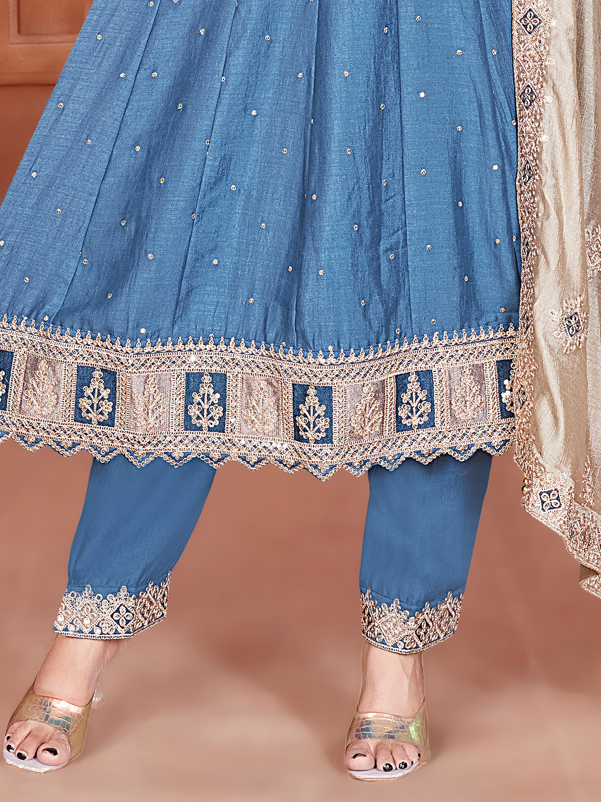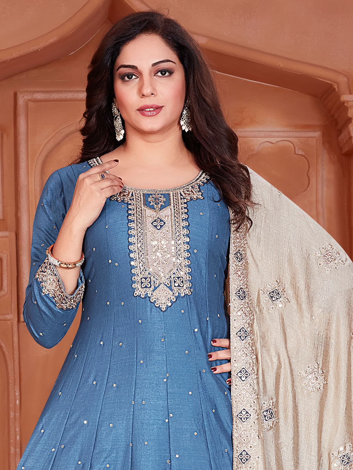 Crafted in soothing light blue silk anarkali suit. Features embroidery and sequin detailing for festive elegance. Designed with a round neckline and quarter sleeves, it is paired with pants and a contrast dupatta, perfect for weddings, sangeet and festive wear.