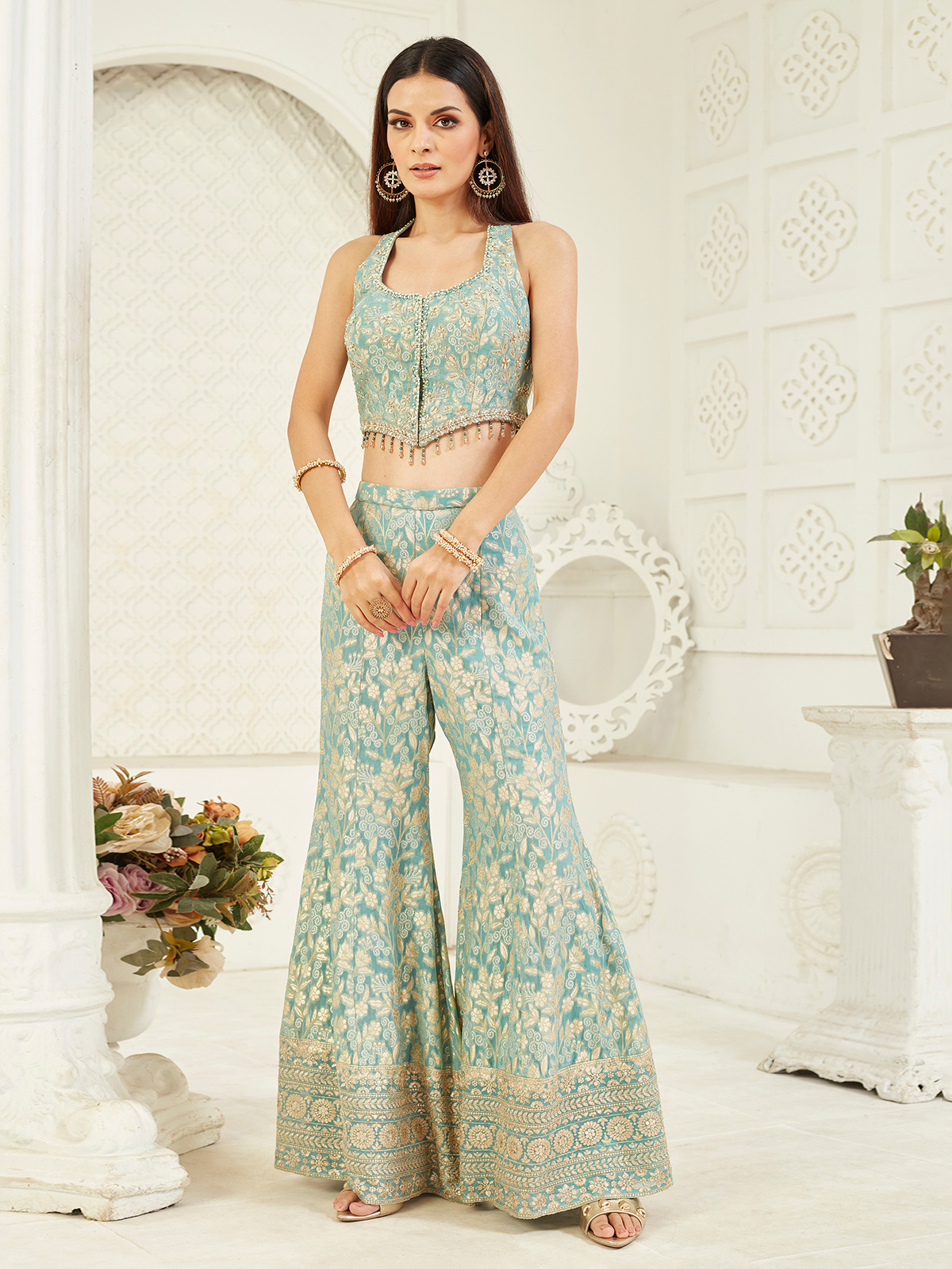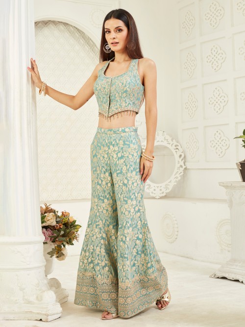 Step into elegance with this light blue silk palazzo suit, adorned with zari, zardosi, mirror, cutdana, sequins, and stone work. The sleeveless top paired with flowing palazzo pants beautifully blends traditional charm with contemporary style. Perfect for receptions and festive celebrations, it ensures a graceful, attention-commanding presence.