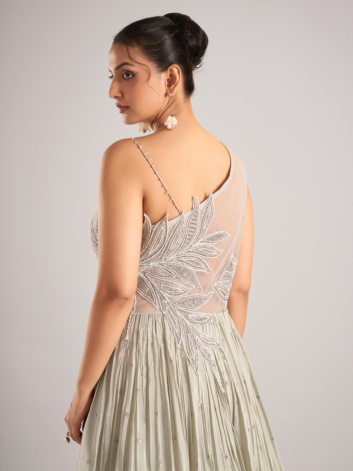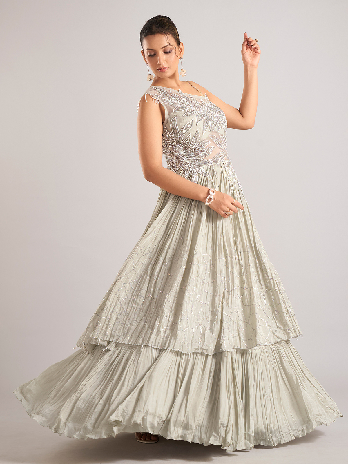 Chic and sophisticated, this light grey silk salwar suit is embellished with resham, beads, sequins, and cutdana work. The sleeveless design and designer detailing make it ideal for festive evenings and elegant party appearances.
