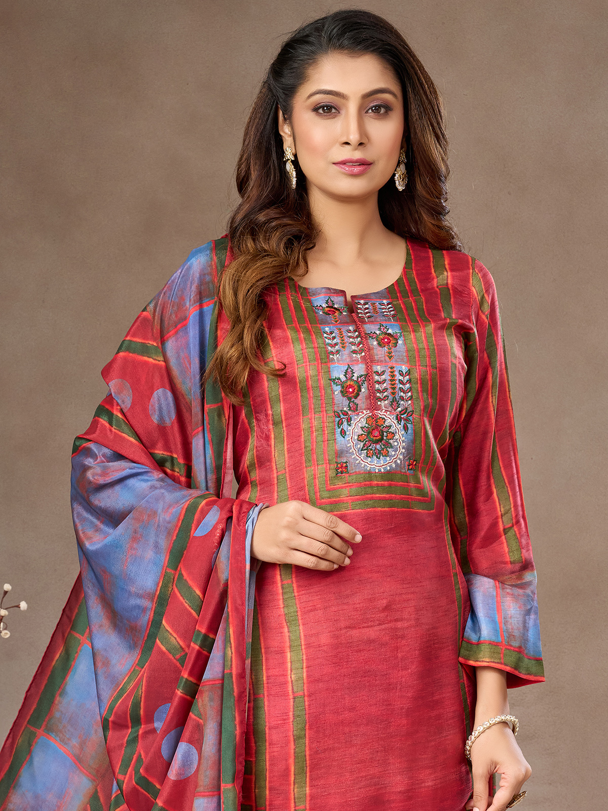 Embellished with embroidery and aabla, this light maroon silk suit features a round neckline and full sleeves. With a printed dupatta, it's perfect for cultural gatherings or intimate festive moments.