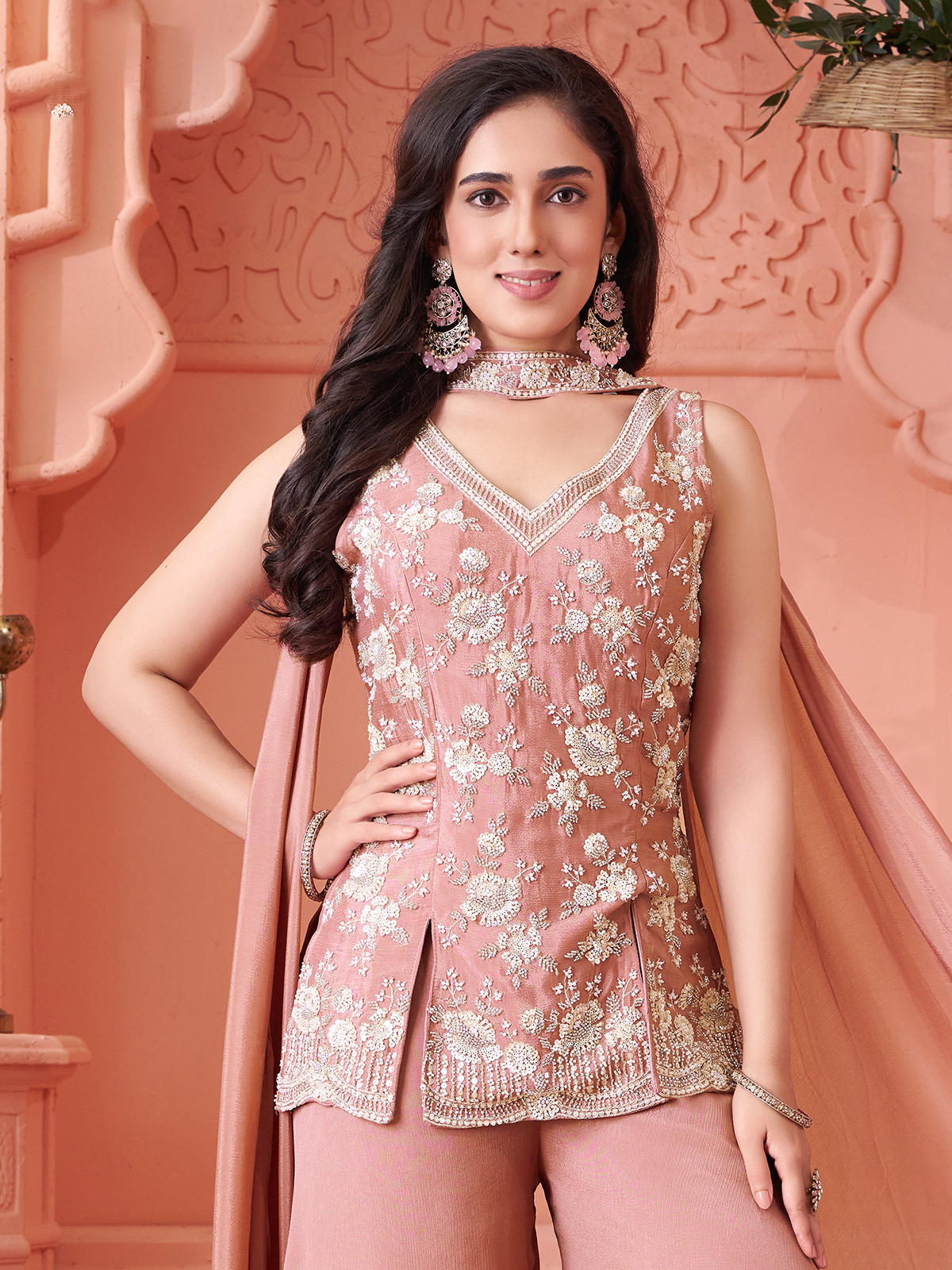 Crafted in soft light pink silk designer palazzo suit is highlighted with cutdana, sequins and bead embellishments. Featuring a V neckline and sleeveless silhouette, it is paired with a coordinated dupatta and palazzo, making it a graceful choice for weddings, sangeet ceremonies, festive wear and elegant receptions.