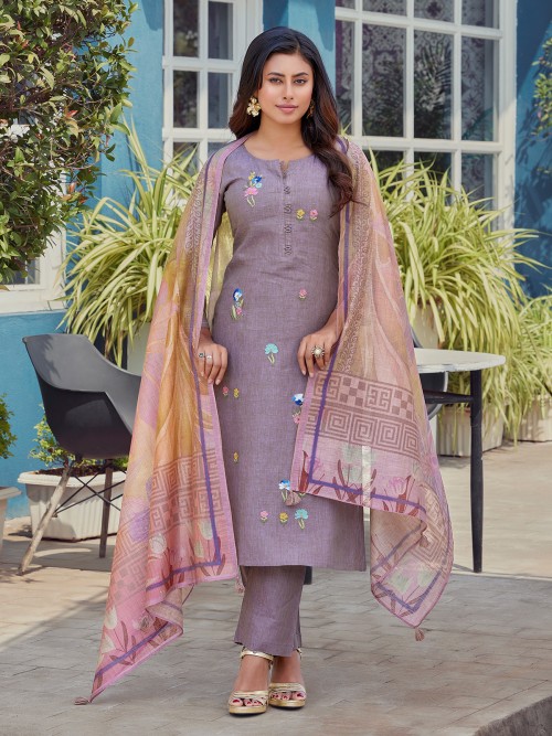 Lilac Purple Cotton Salwar Suit With Thread Work