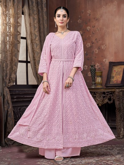 Graceful lilac purple georgette palazzo suit. Enhanced with elegant embroidery and sequin detailing. Styled with a V neckline, quarter sleeves and a waist belt, it is paired with a palazzo and dupatta for weddings and festive evenings.