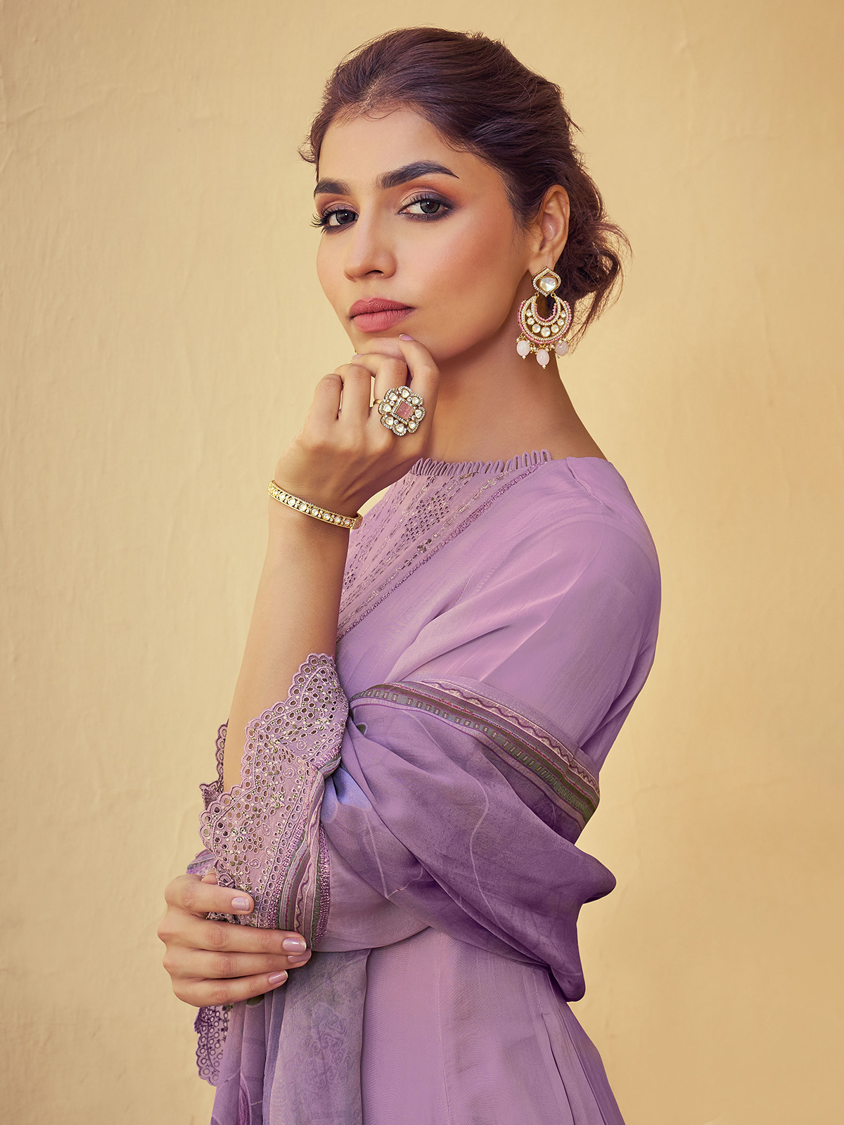 Look regal in this lilac purple salwar suit, featuring soft organza fabric with sequins, resham, and cutwork embellishments. The boat neck and quarter sleeves offer a modern yet traditional silhouette. Comes with a pant and elegant dupatta.
