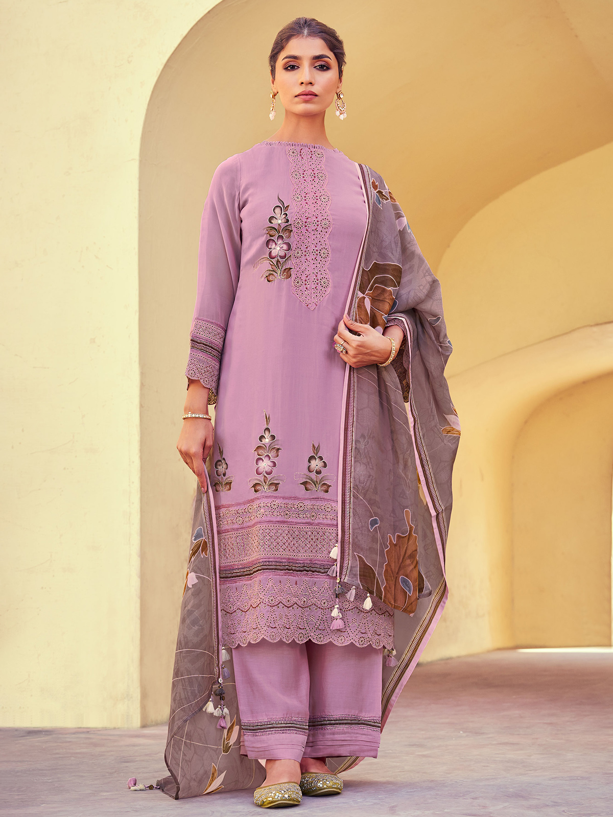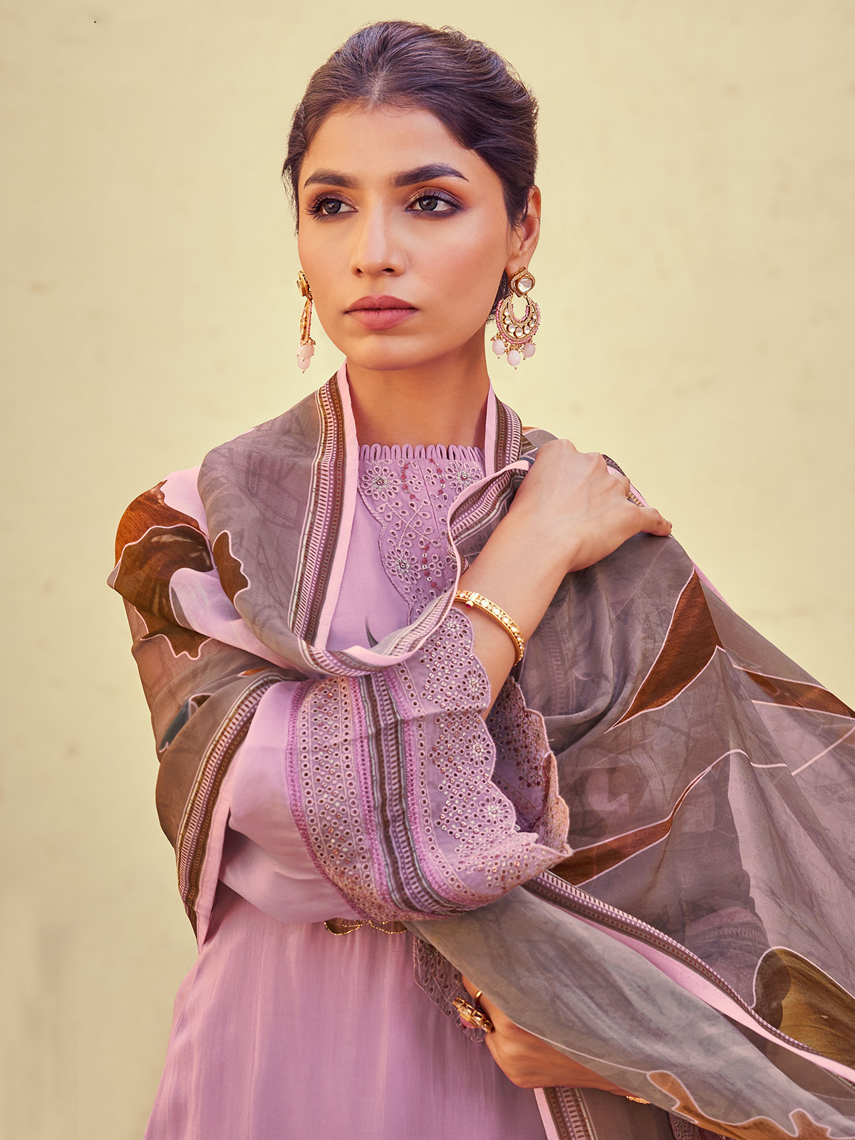 Graceful and elegant, this lilac purple palazzo suit in organza is adorned with sequins, resham, and cutwork. The round neckline and quarter sleeves add classic charm, complemented by printed dupatta and pants.