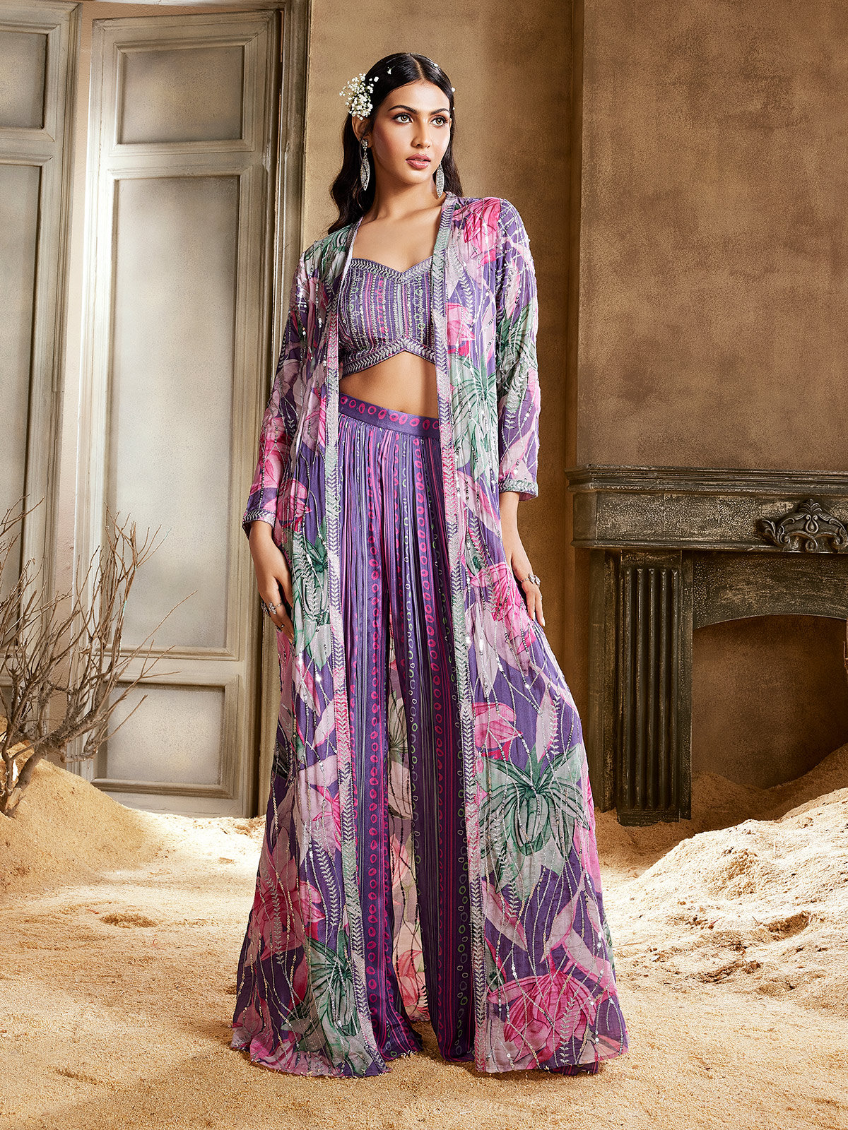 Perfect for destination weddings, the lilac purple georgette printed jacket style palazzo suit showcases stunning sequins, zari and resham work for a vibrant look.