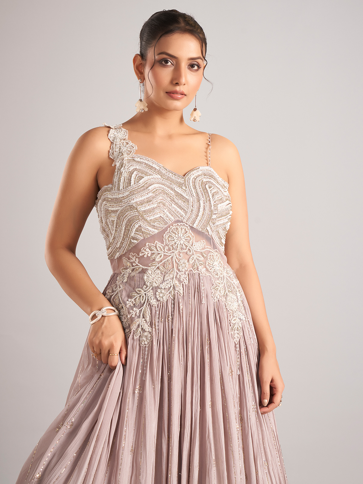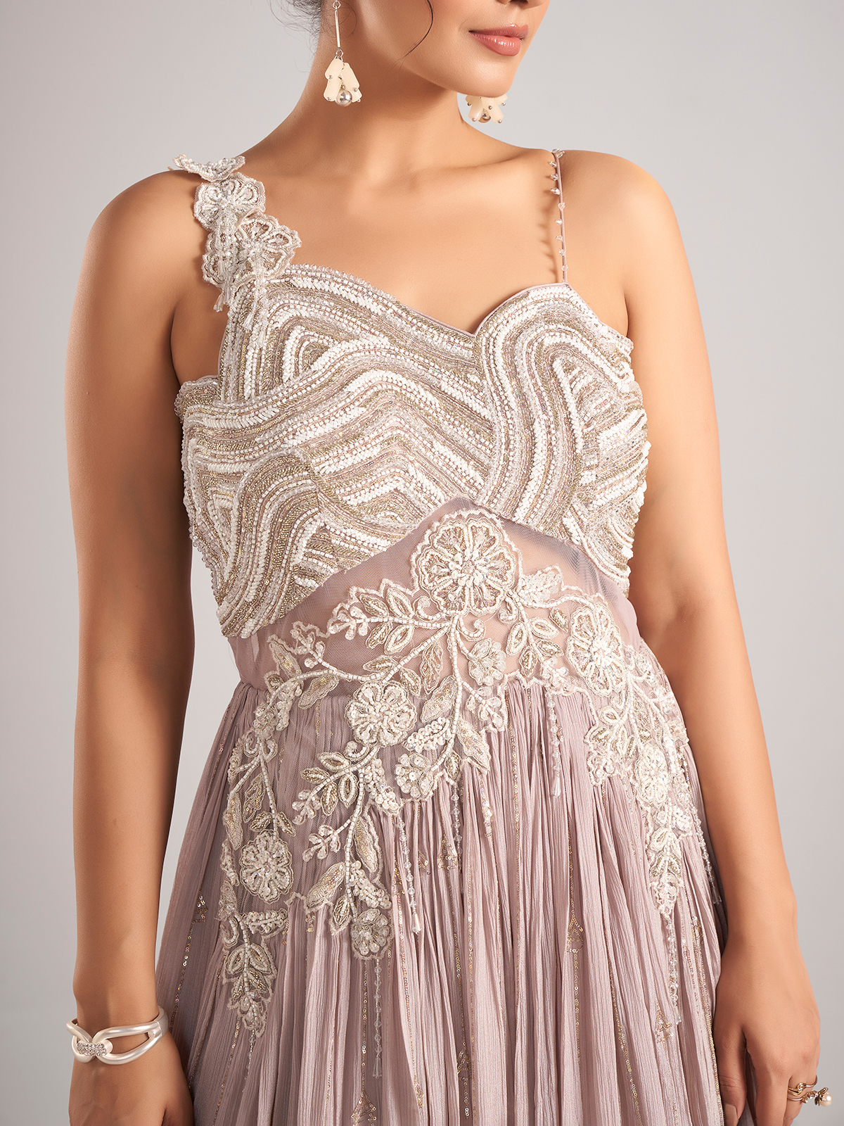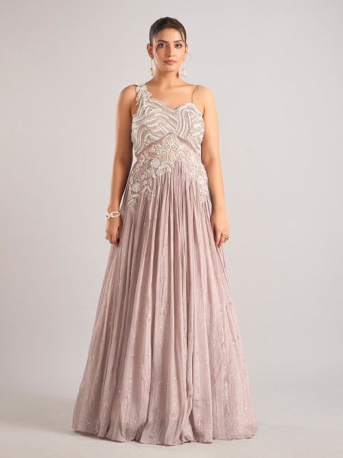 Add soft elegance to your festive wardrobe with this lilac purple silk salwar suit adorned with cutdana, sequins, and beadwork. The sleeveless cut offers a stylish finish, perfect for parties and celebratory gatherings.