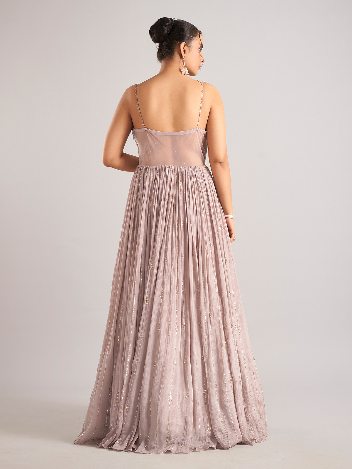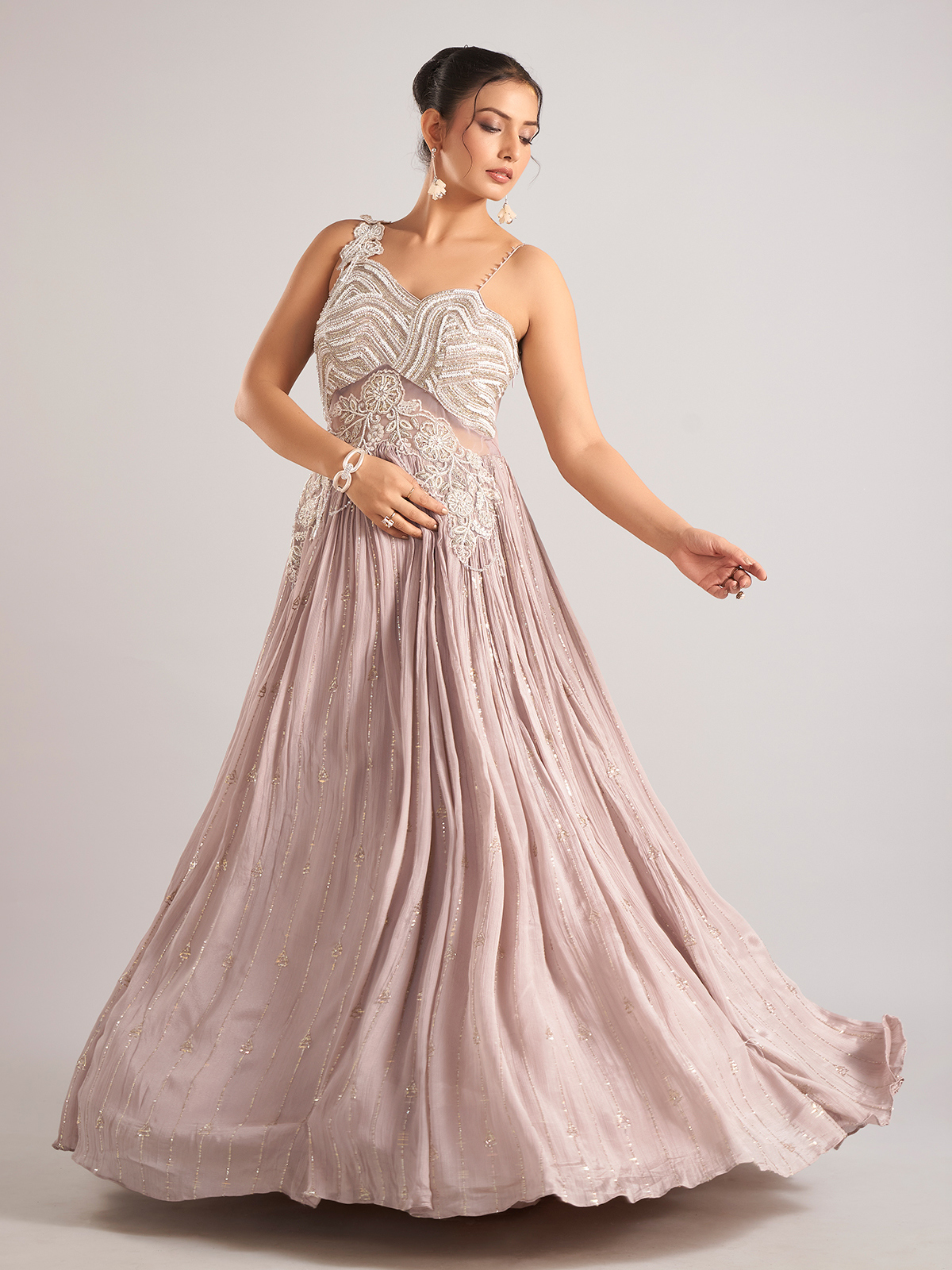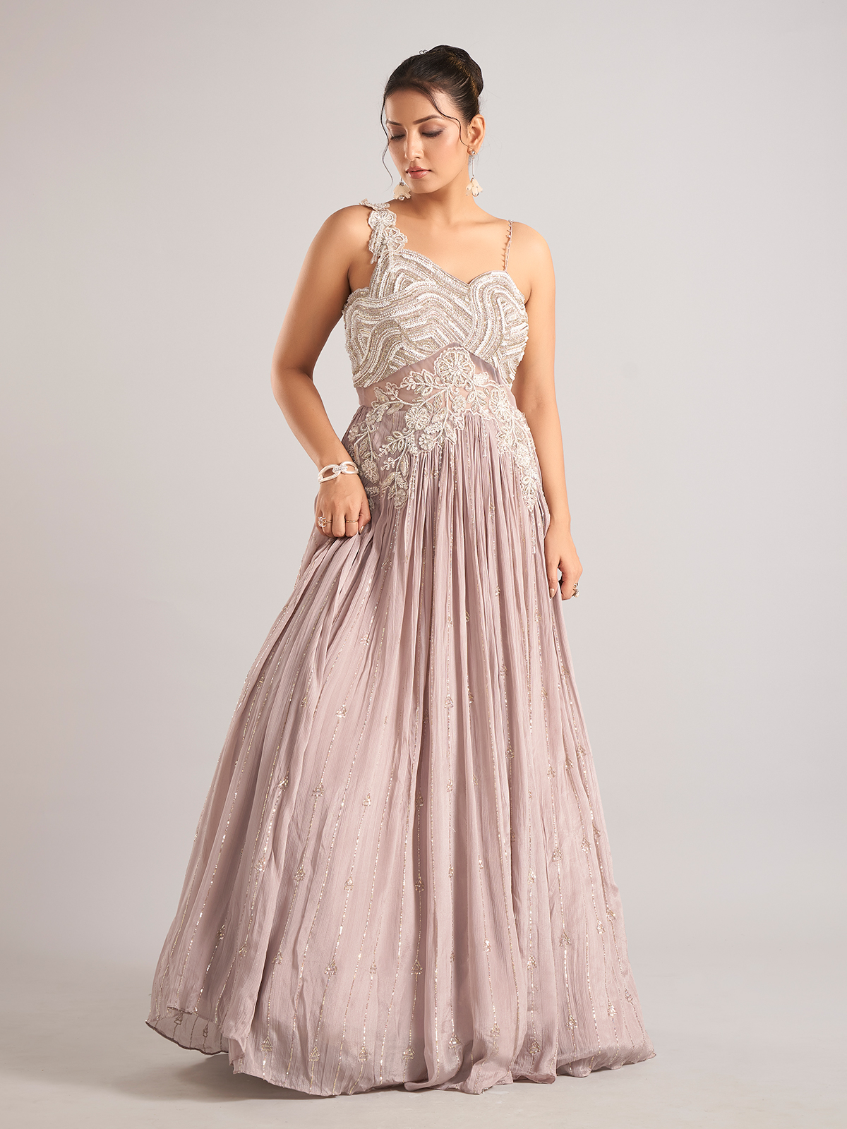 Add soft elegance to your festive wardrobe with this lilac purple silk salwar suit adorned with cutdana, sequins, and beadwork. The sleeveless cut offers a stylish finish, perfect for parties and celebratory gatherings.