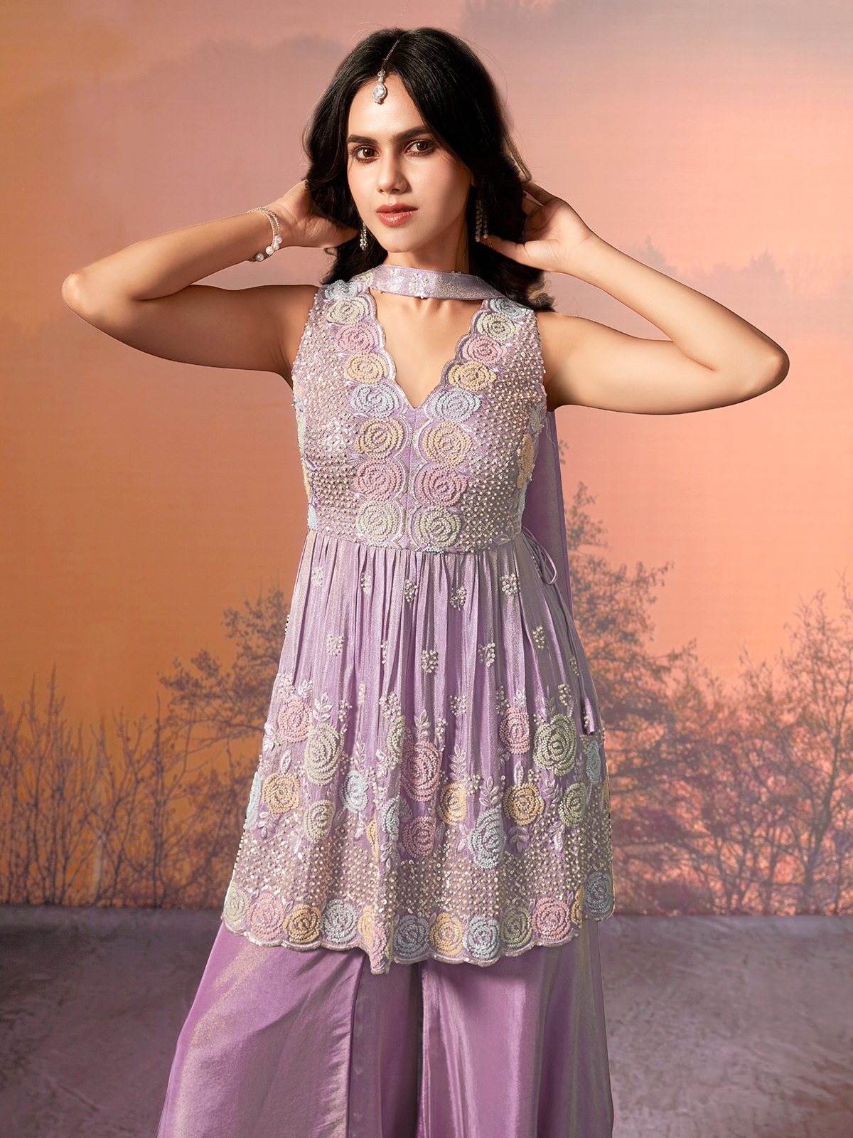 Designed in soft lilac purple tissue silk palazzo suit is adorned with embroidery, cutdana, sequins and pearl accents. Styled with a flattering V neckline and sleeveless blouse, it is paired with a graceful dupatta. A refined choice for weddings, receptions and elegant festive gatherings.