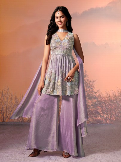Lilac Purple Tissue Silk Embellished Palazzo Suit