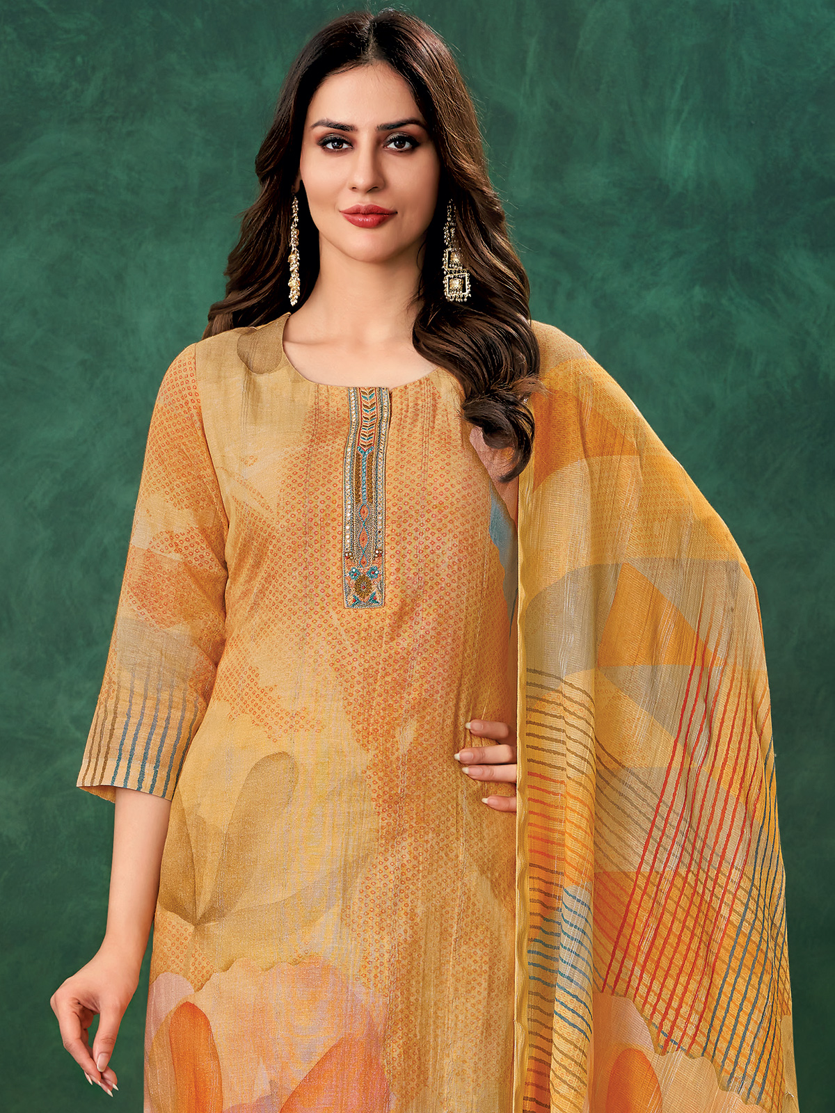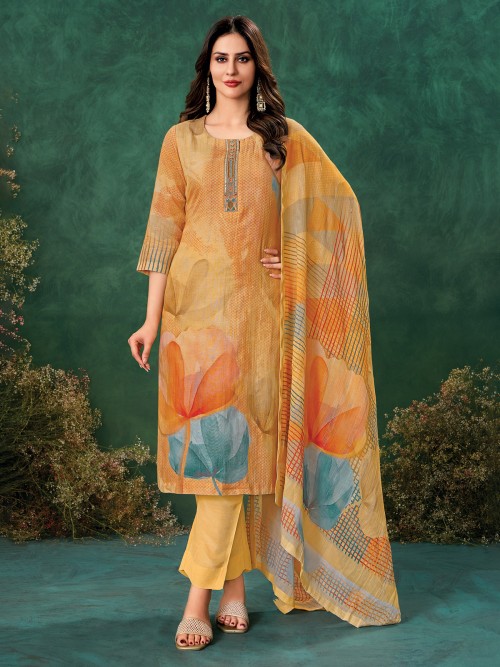 Brighten up your wardrobe with this stunning yellow salwar suit, crafted from soft linen and adorned with elegant thread work. Featuring a round neckline and quarter sleeves, it comes with a matching bottom and dupatta, perfect for adding a touch of sophistication to any special occasion.