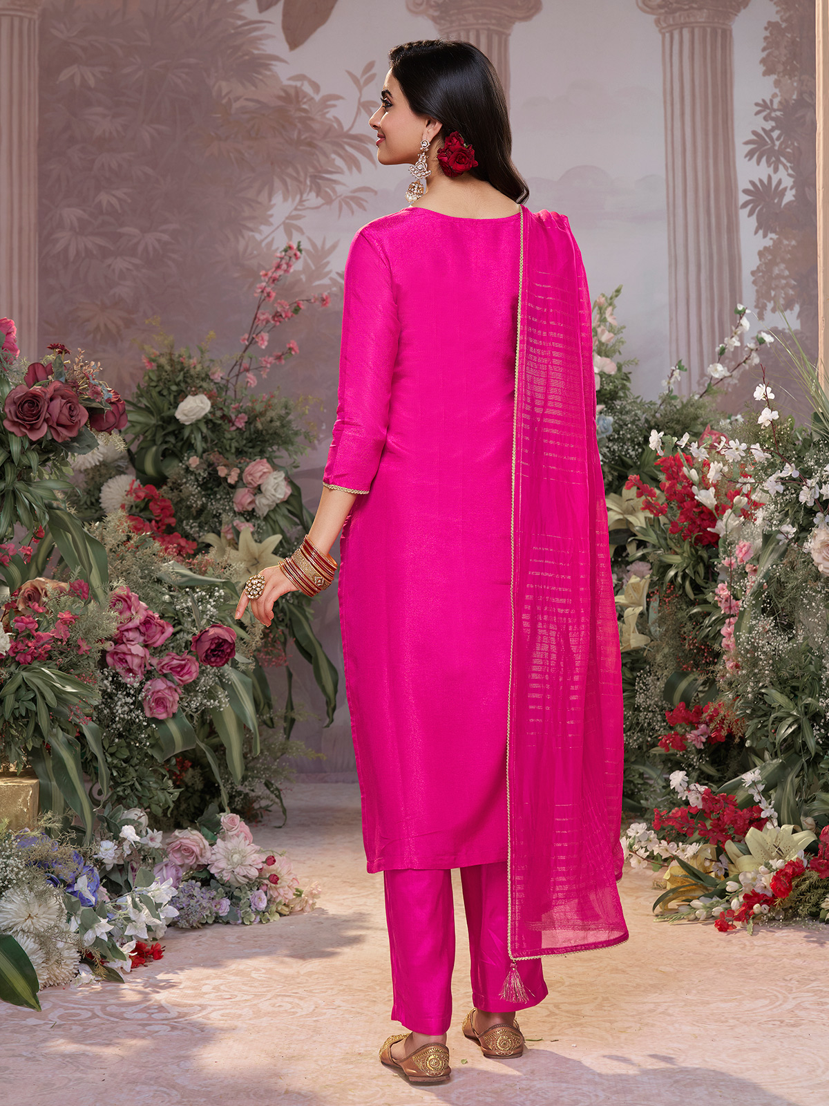 This magenta Banarasi silk salwar suit gleams with rich resham, sequins, and zari work. Styled with a U neckline and quarter sleeves, it includes pants and a dupatta — an ode to timeless tradition, ideal for cultural and festive celebrations.