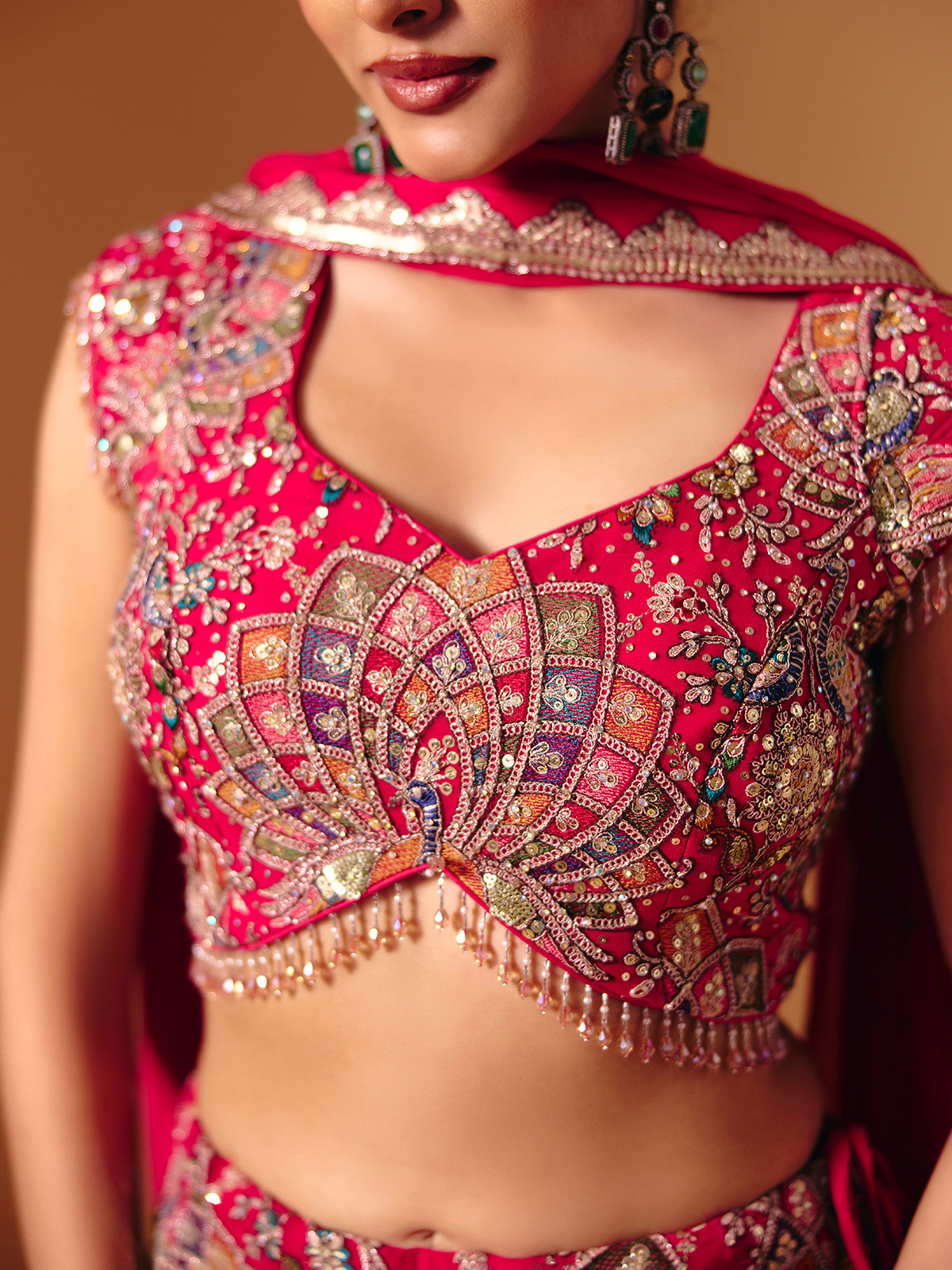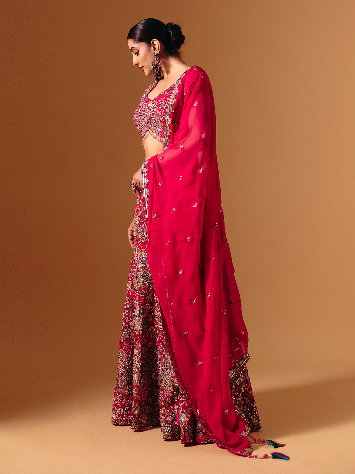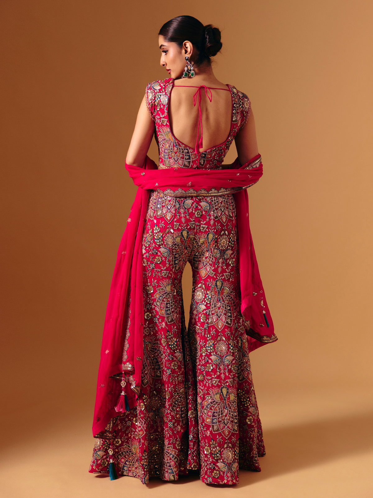 Rendered in flowing magenta georgette, this Pakistani-style palazzo suit is enriched with detailed embroidery highlighted by sequins, cutdana, zardosi and stone work. The sleeveless sweetheart neckline, paired palazzo and dupatta together create an elegant festive look ideal for weddings, sangeet functions and celebrations.