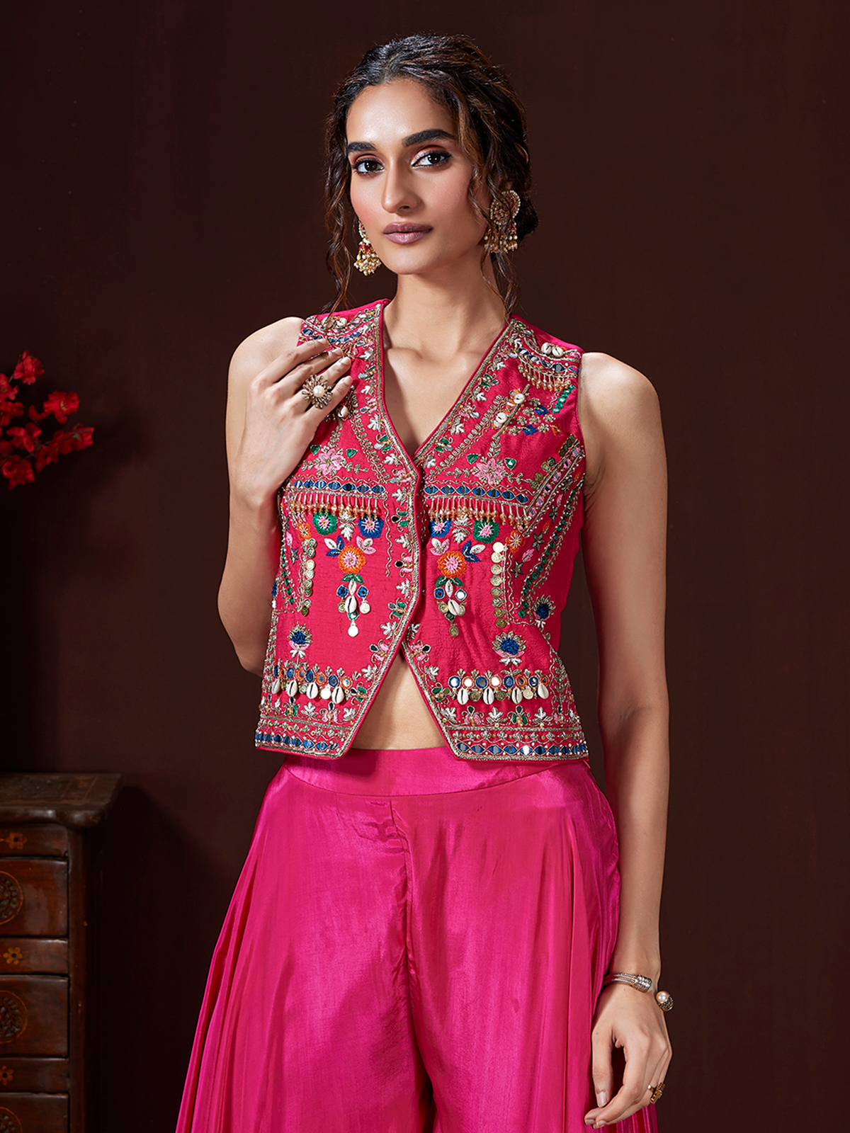 Sparkle boldly in magenta satin silk, featuring beads, cutdana, cowrie shells, sequins, coins, and mirror work for wedding-worthy brilliance. A V-neck sleeveless top adds modern edge, while palazzo pants flow with stylish rhythm.