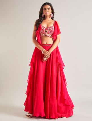This magenta silk outfit carries resham, sequins, beads, cutdana, aabla and zardosi detailing. Styled with a sweetheart neckline and quarter sleeves, it includes a dupatta and pant, making it ideal for sangeet, weddings and festive occasions.